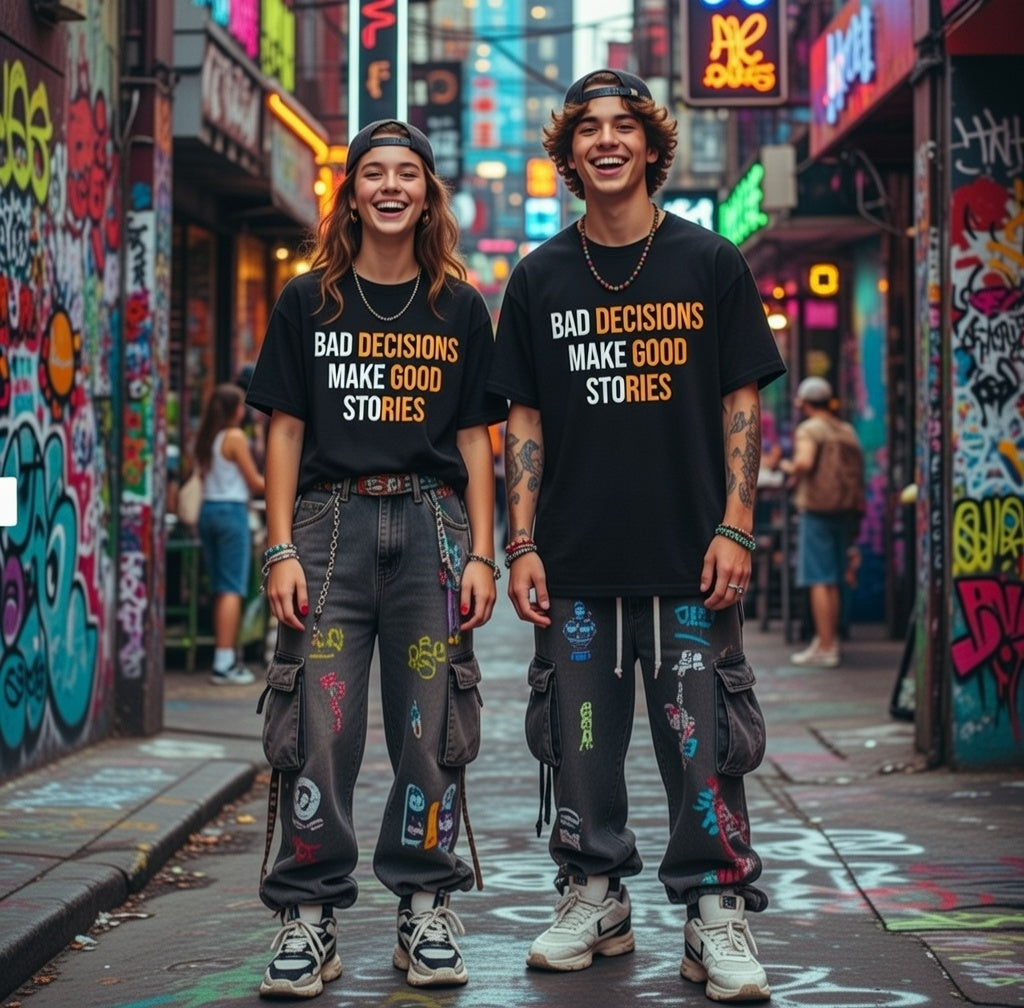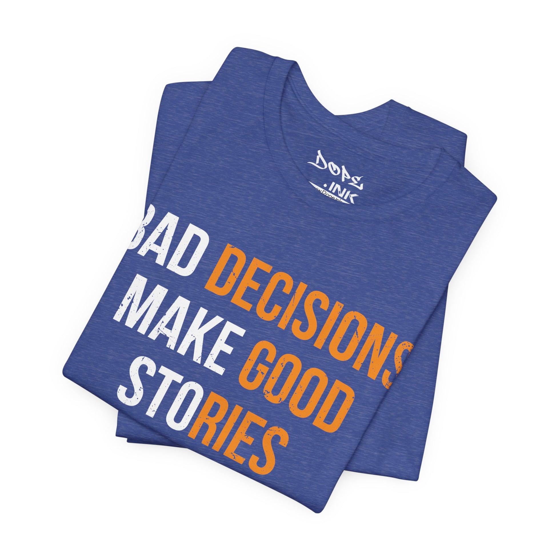 Live without regrets in our "Bad Decisions" Streetwear from Dope.Ink! This premium unisex short-sleeve piece drops the truth in bold distressed text: "BAD DECISIONS MAKE GOOD STORIES" with "DECISIONS" and "STORIES" popping in gritty orange—perfect for risk-takers, storytellers, party legends, or anyone who knows the best memories come from the wildest choices on nights out, road trips, or spontaneous adventures.