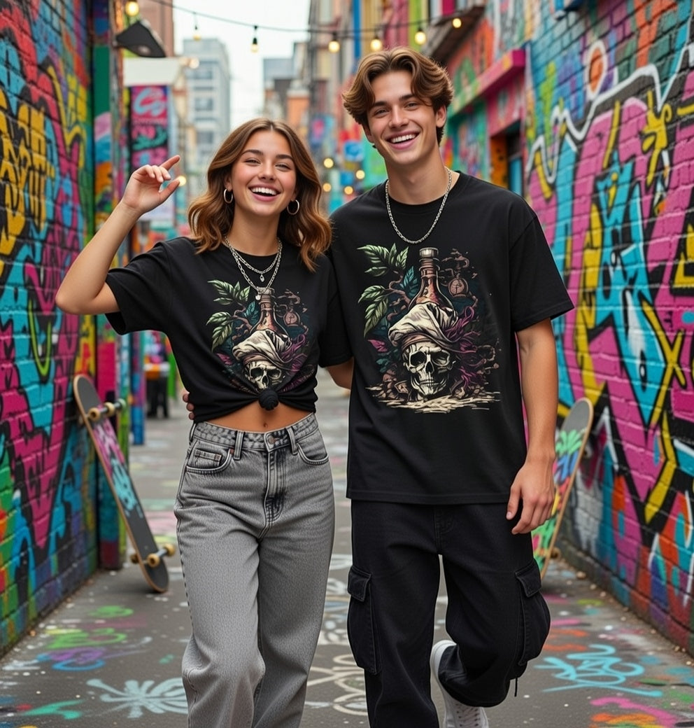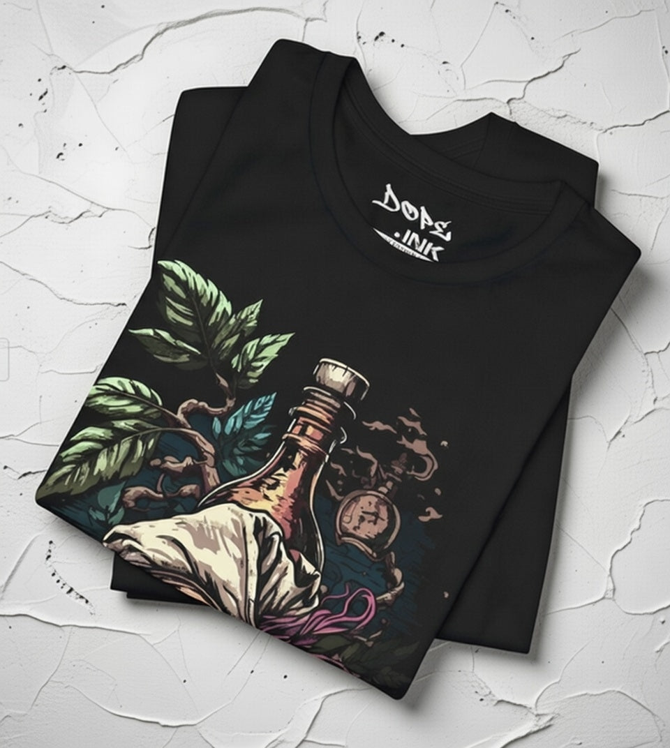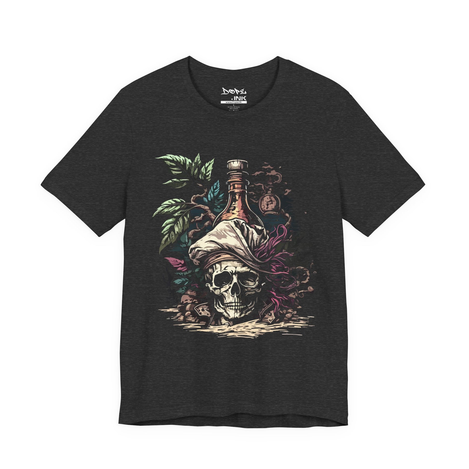 Sail into the unknown with our "Pirate Poison" Streetwear from Dope.Ink! This premium black unisex short-sleeve piece channels cursed treasure vibes with a grinning skull rocking a tattered bandana and feather, a glowing rum bottle perched on top, surrounded by twisted vines and jungle mystery—straight fire for pirate souls, rum runners, adventure seekers, or anyone living that "yo ho ho and a bottle of chaos" life on beach days, parties, or whenever you're plotting your next escape.
