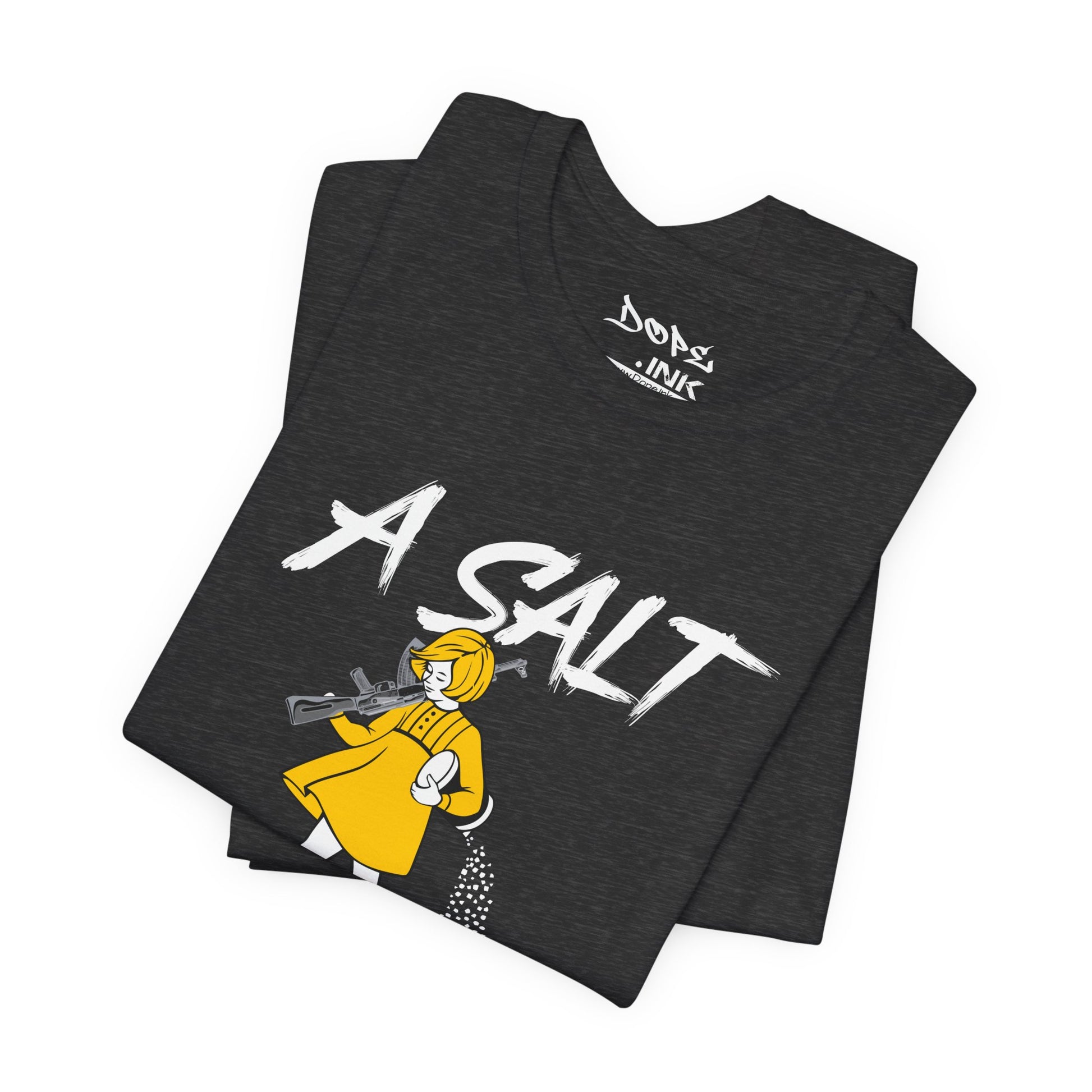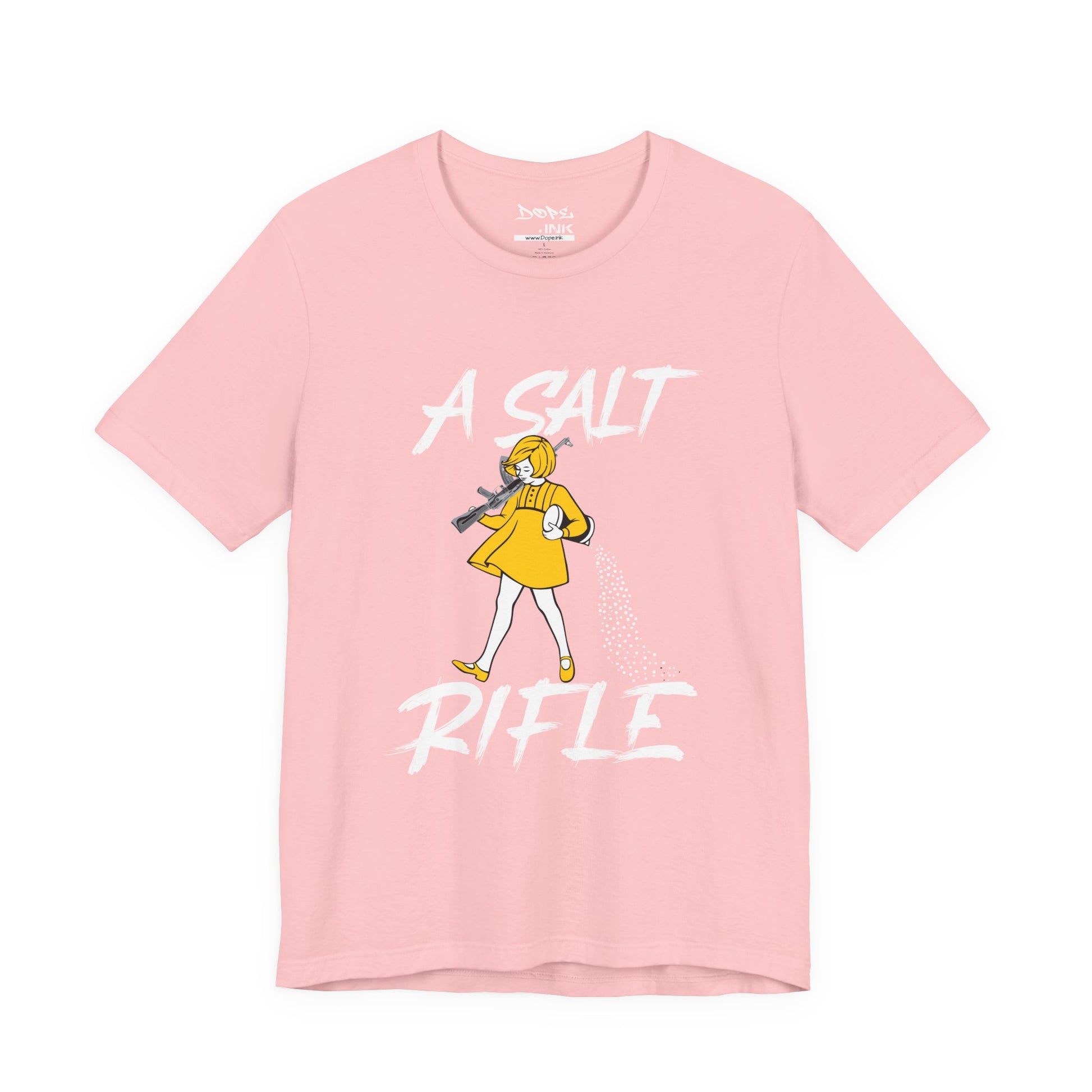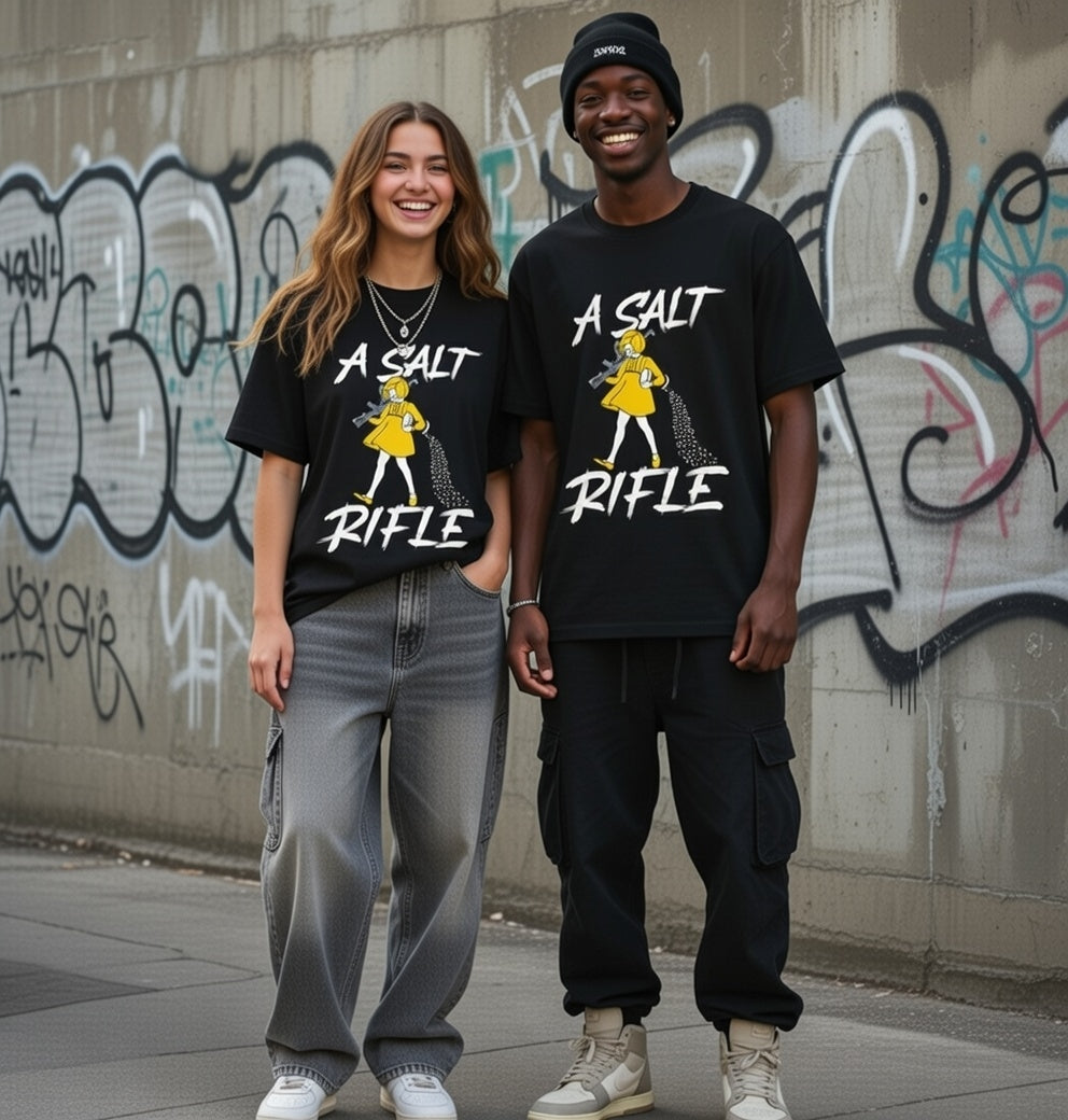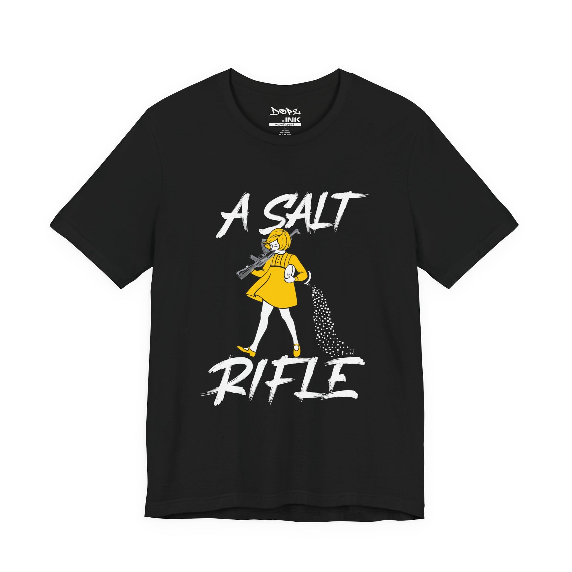 Season your enemies with our "A Salt Rifle" Streetwear from Dope.Ink! This premium unisex short-sleeve piece features a sassy little girl in a yellow dress armed with a massive assault rifle that's blasting a trail of salt—pure petty revenge energy for gamers dealing with toxic lobbies, snack defenders, or anyone ready to throw maximum shade with zero chill on salty days, rage quits, or when the haters need that extra seasoning.
