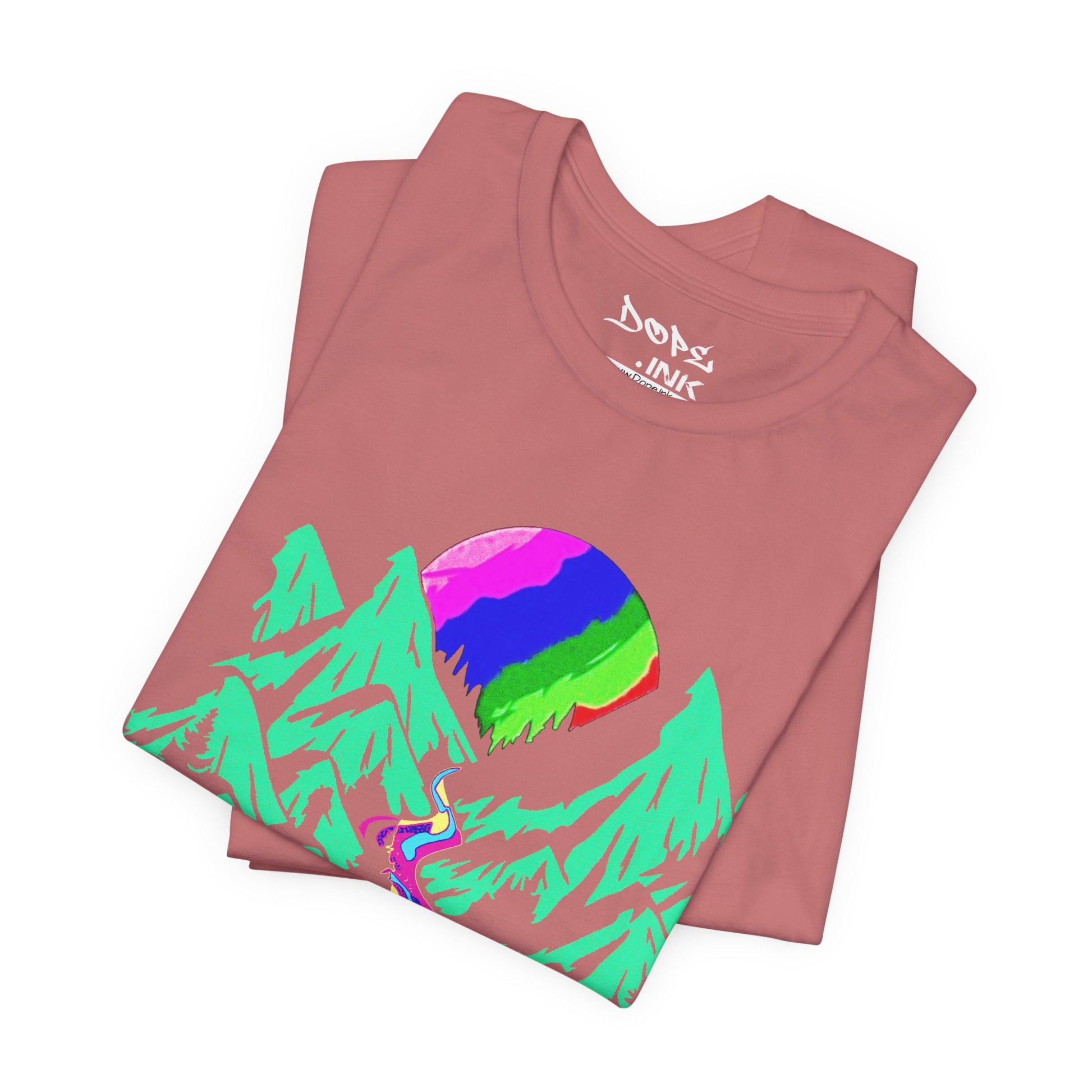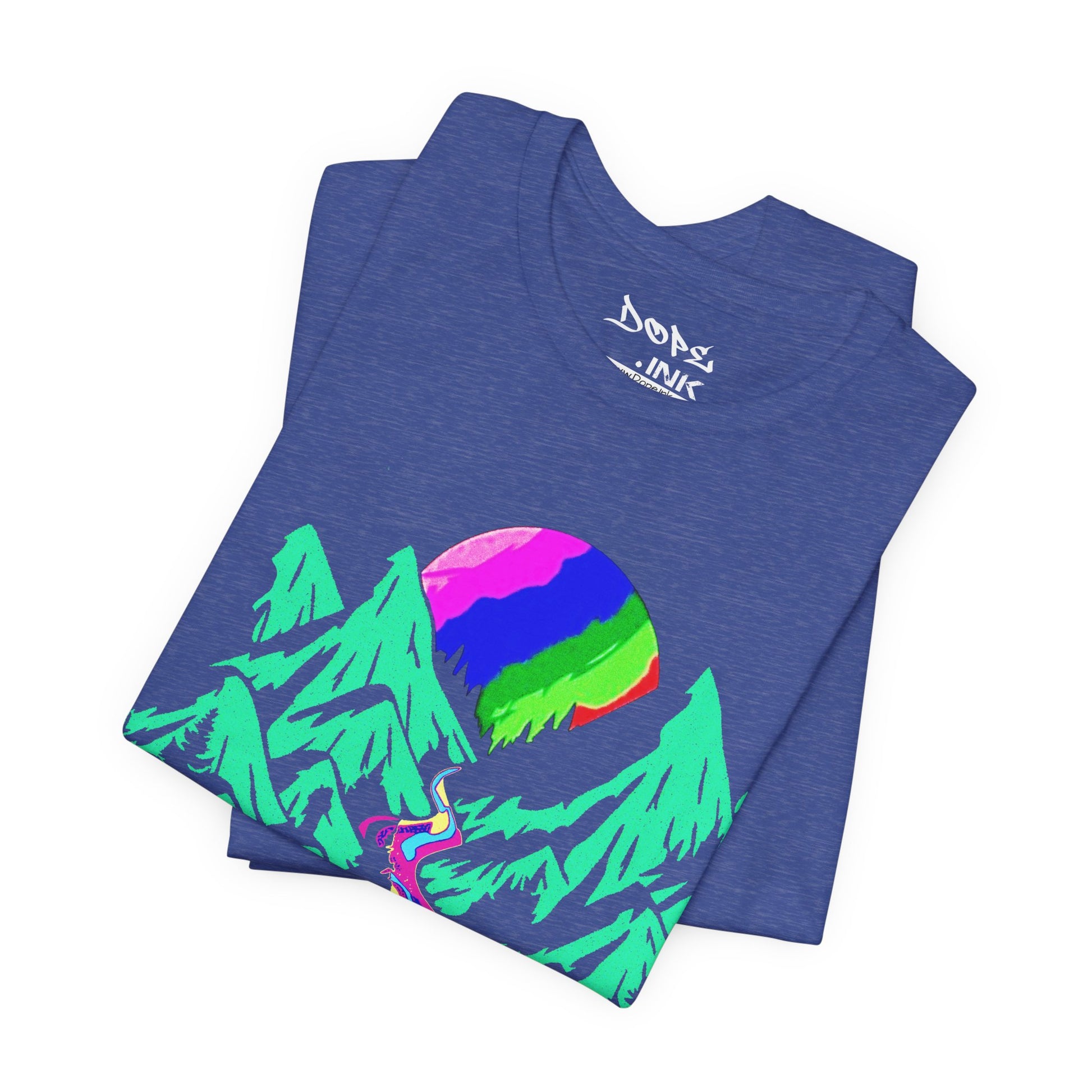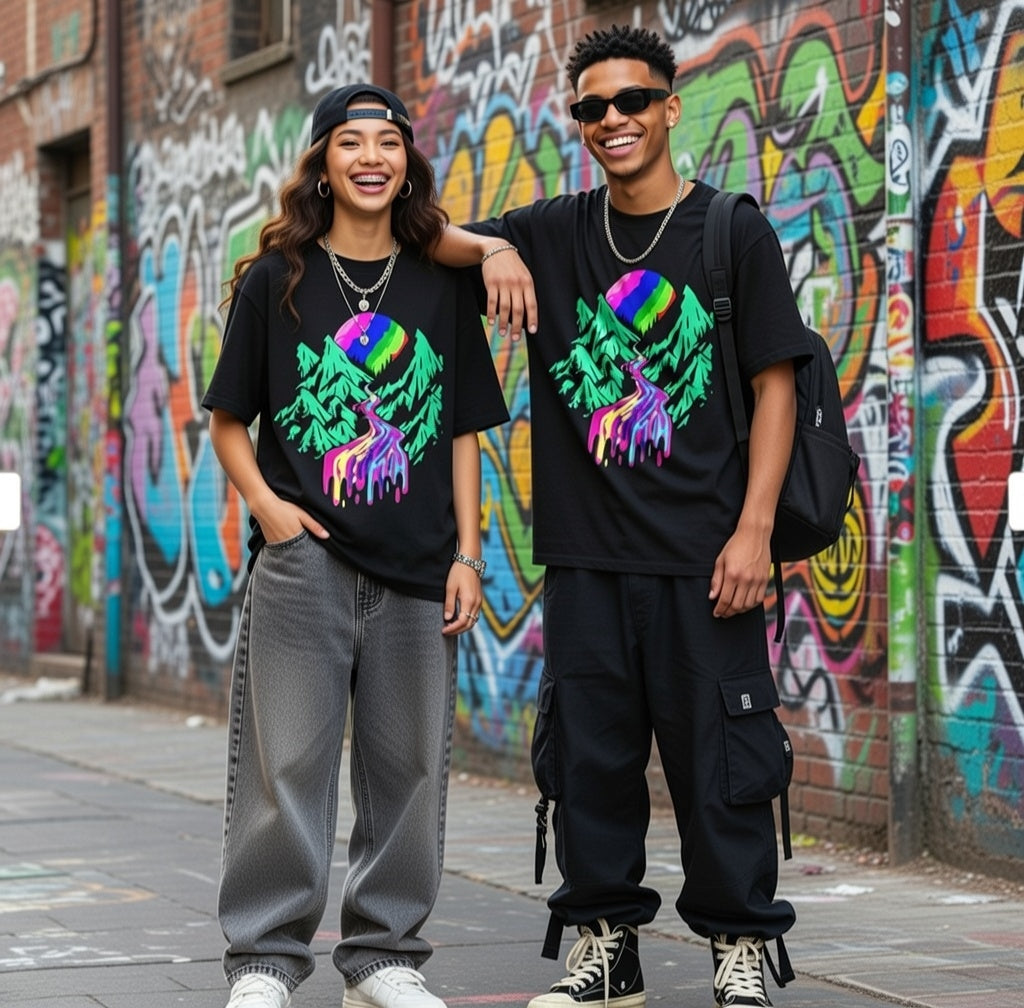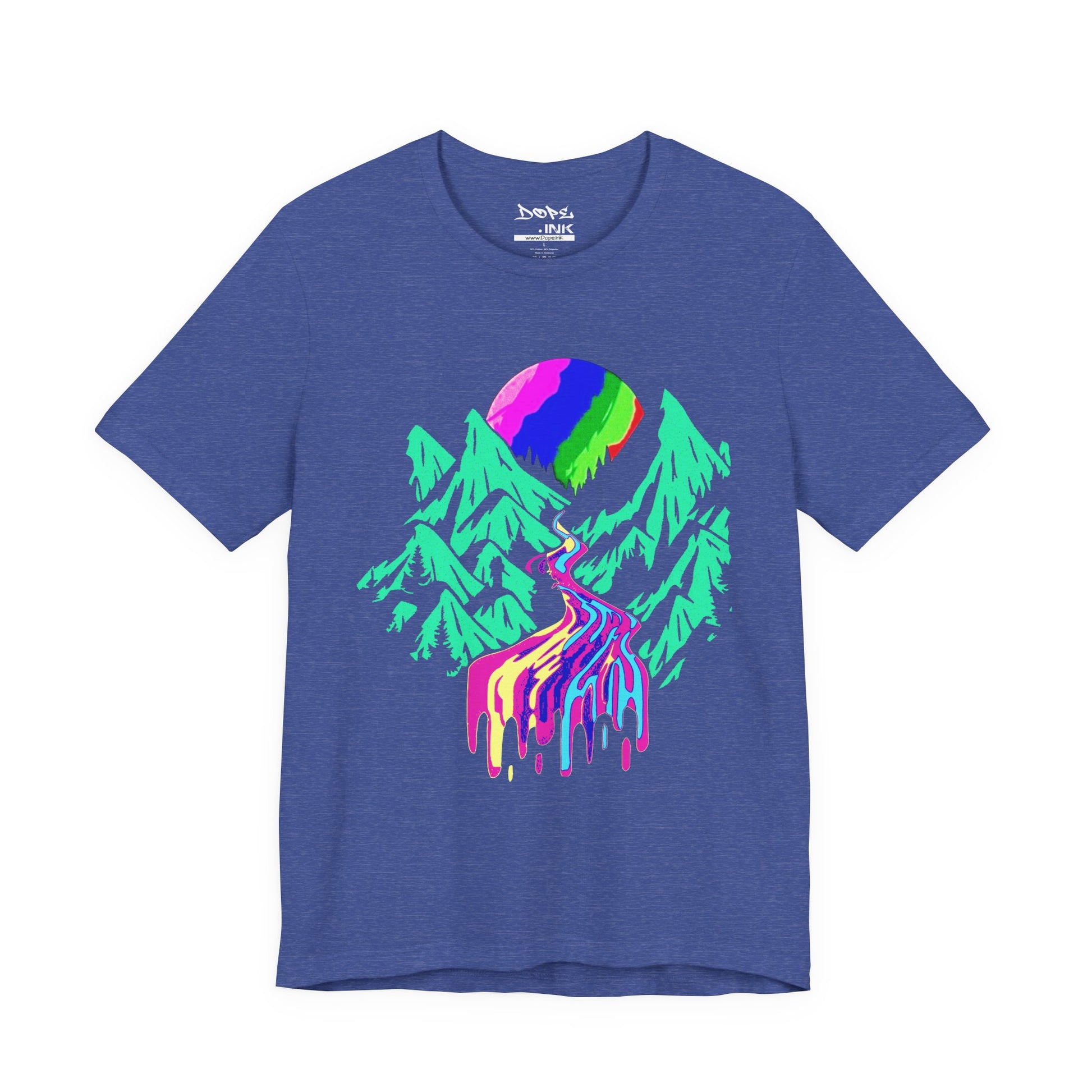 Drip into the surreal with our "Acid Mountain" Streetwear from Dope.Ink! This premium black unisex short-sleeve piece explodes with a psychedelic rainbow moon rising over jagged teal peaks, a winding river melting into vibrant dripping colors—pure trippy wilderness magic for festival ravers, psychonauts, nature mystics, or anyone escaping reality into bold, mind-bending vibes on trails, late nights, or whenever you crave that electric outdoor escape.