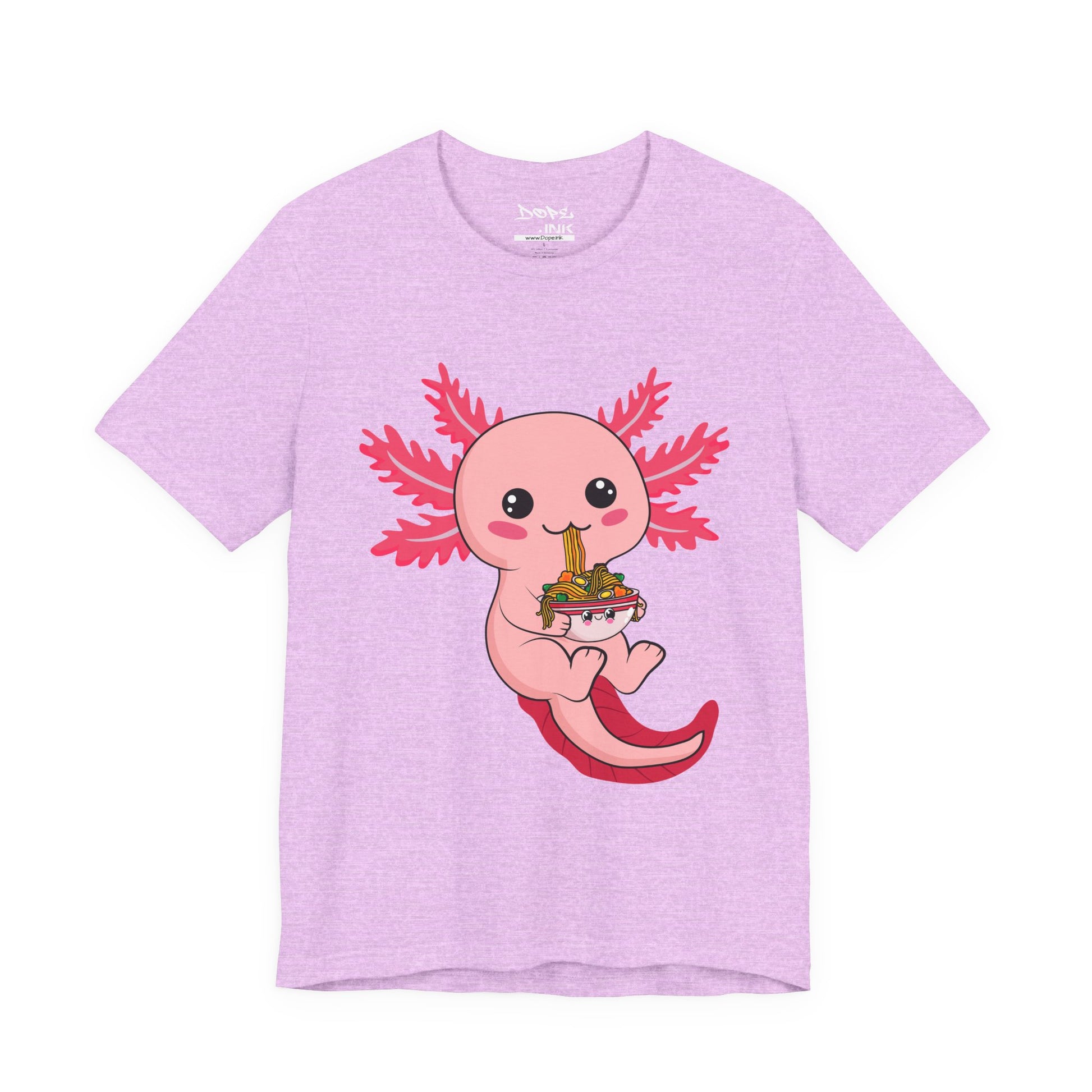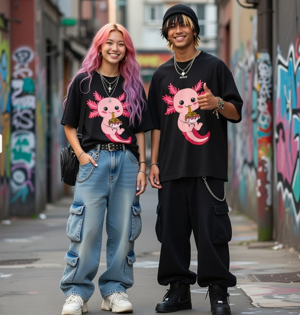 Slurp in style with our "Axolotl & Ramen" Streetwear from Dope.Ink! This premium unisex short-sleeve piece features an adorable pink axolotl happily munching on a big bowl of colorful ramen noodles, chonky cheeks and all—perfect for kawaii fans, ramen obsessives, aquatic cuties collectors, or anyone craving that bubbly, feel-good vibe on foodie adventures, cozy nights in, or whenever hunger strikes with maximum charm.