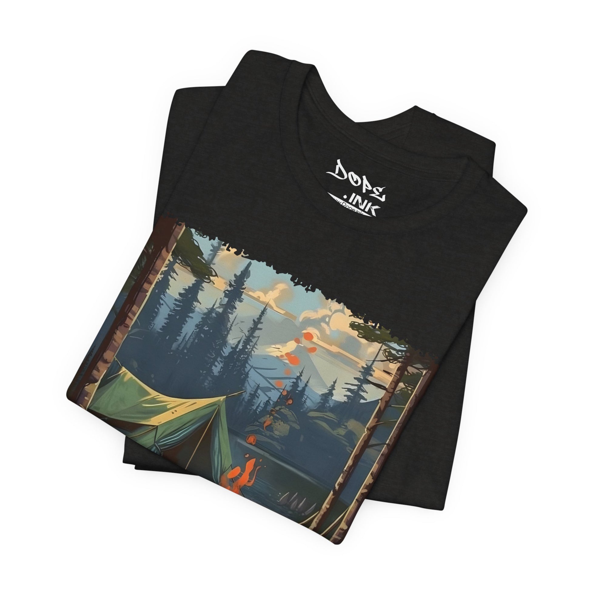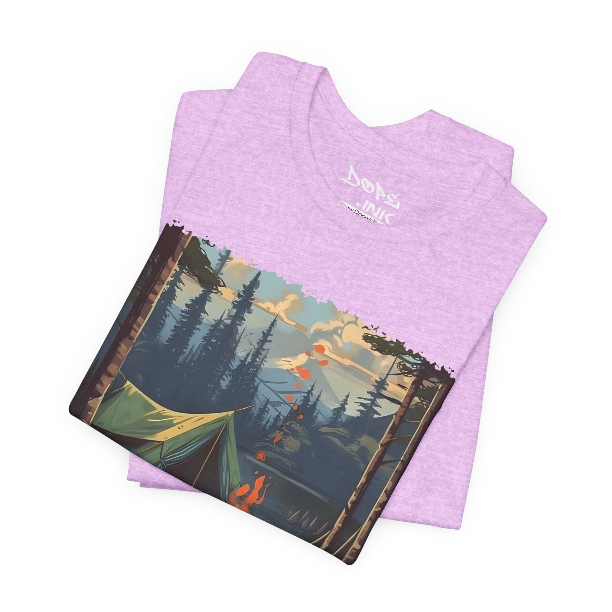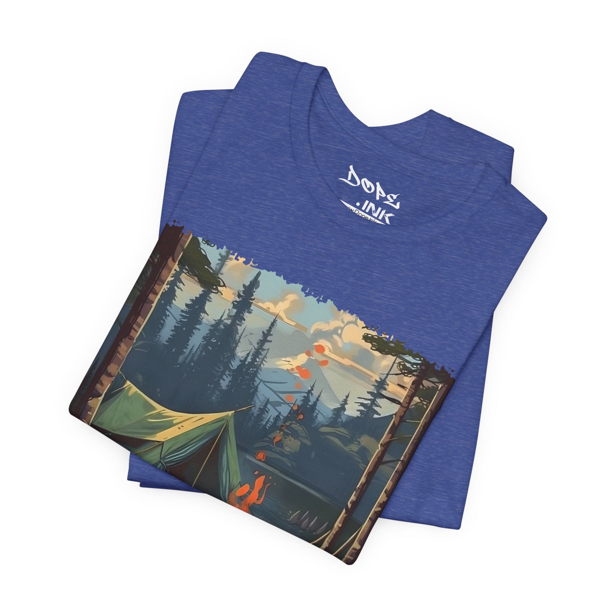 Escape the grind with our "Camp Serenity" Streetwear from Dope.Ink! This premium unisex short-sleeve piece captures pure wilderness bliss: a cozy tent pitched by a tranquil lake, crackling campfire in the foreground, towering pines framing distant mountains under a golden sunset—perfect for outdoor adventurers, nature rebels, weekend warriors, or anyone craving that off-grid peace on hikes, road trips, or chill city escapes.