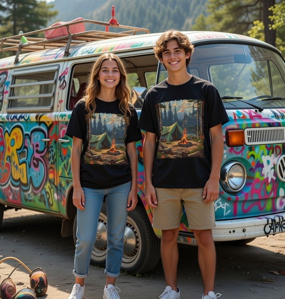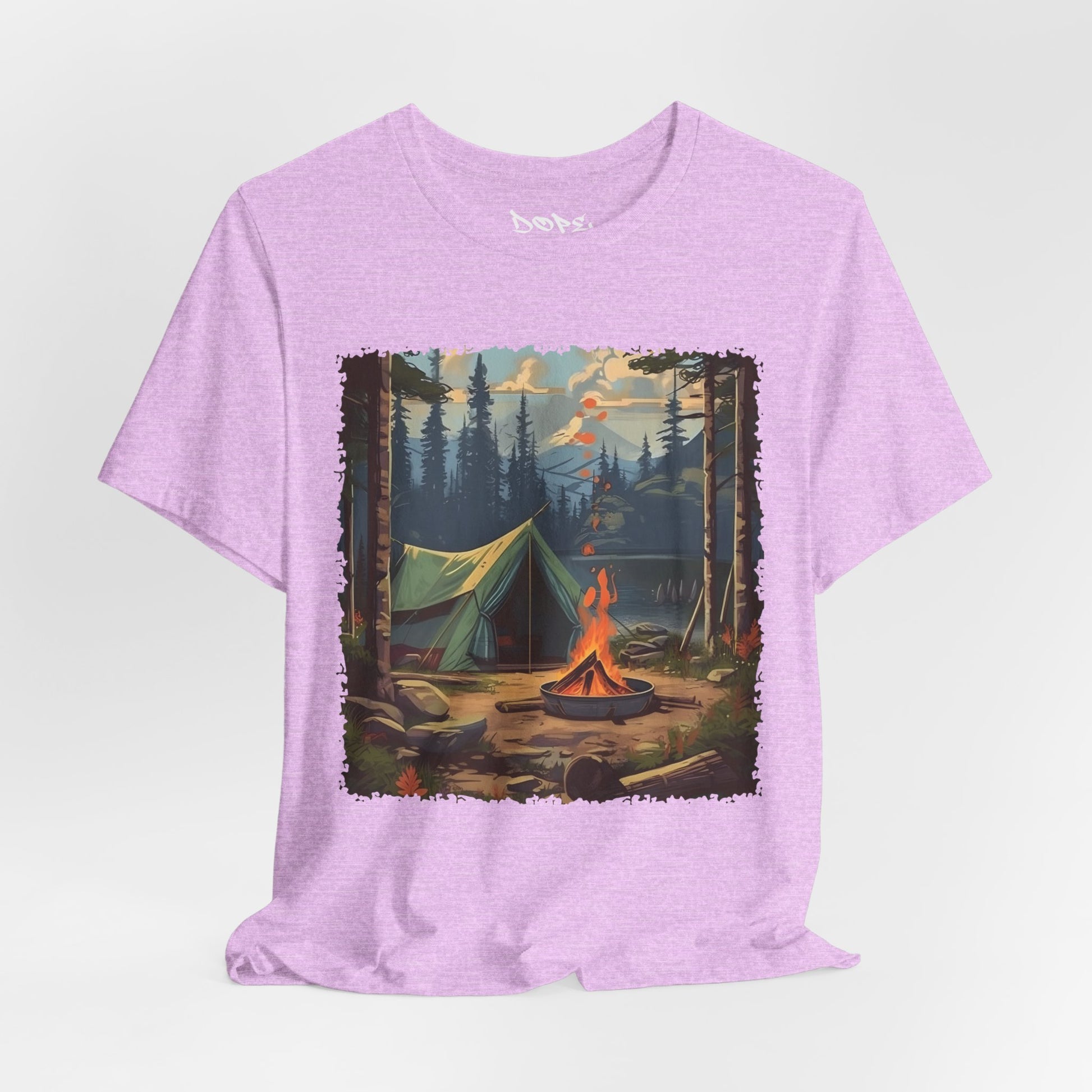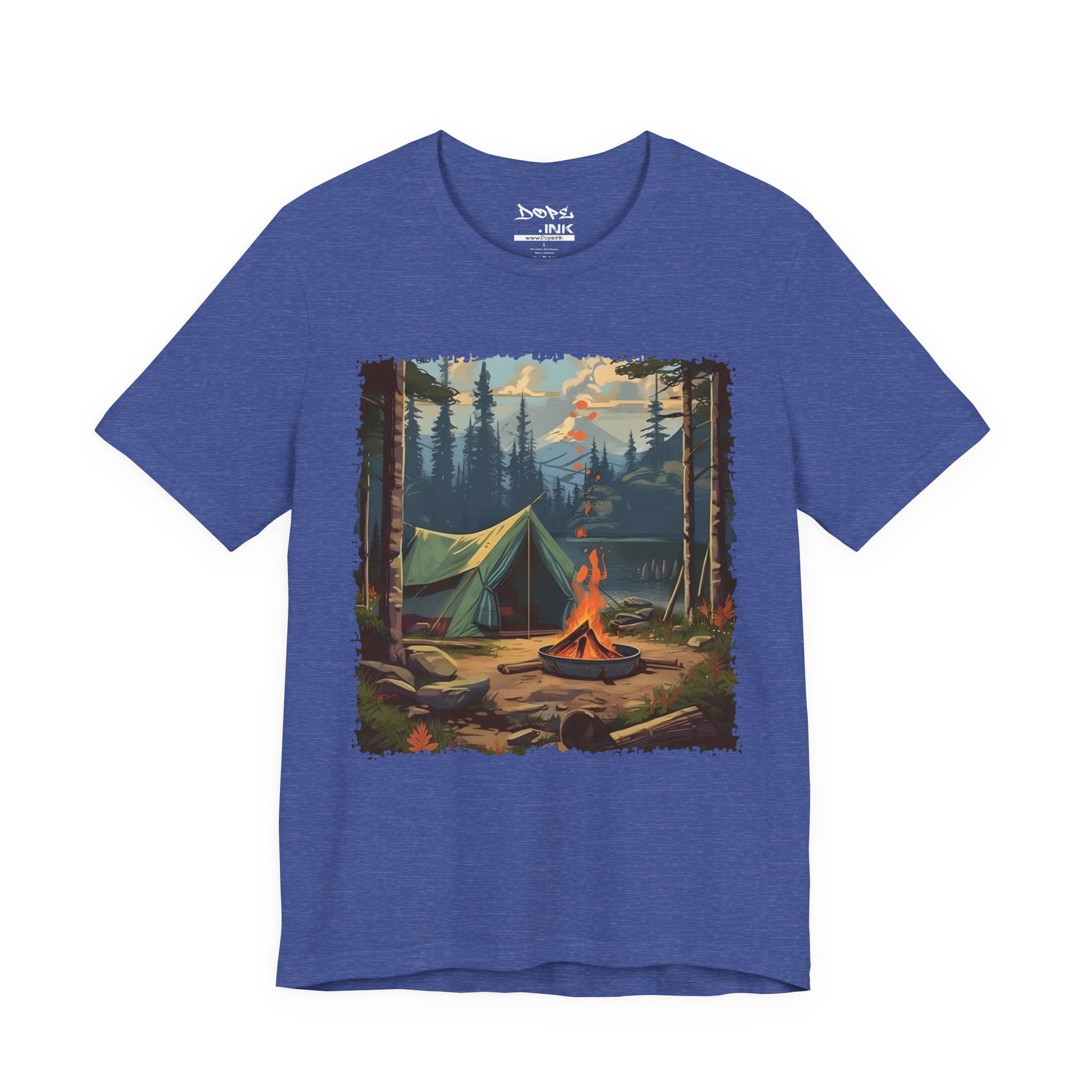 Escape the grind with our "Camp Serenity" Streetwear from Dope.Ink! This premium unisex short-sleeve piece captures pure wilderness bliss: a cozy tent pitched by a tranquil lake, crackling campfire in the foreground, towering pines framing distant mountains under a golden sunset—perfect for outdoor adventurers, nature rebels, weekend warriors, or anyone craving that off-grid peace on hikes, road trips, or chill city escapes.