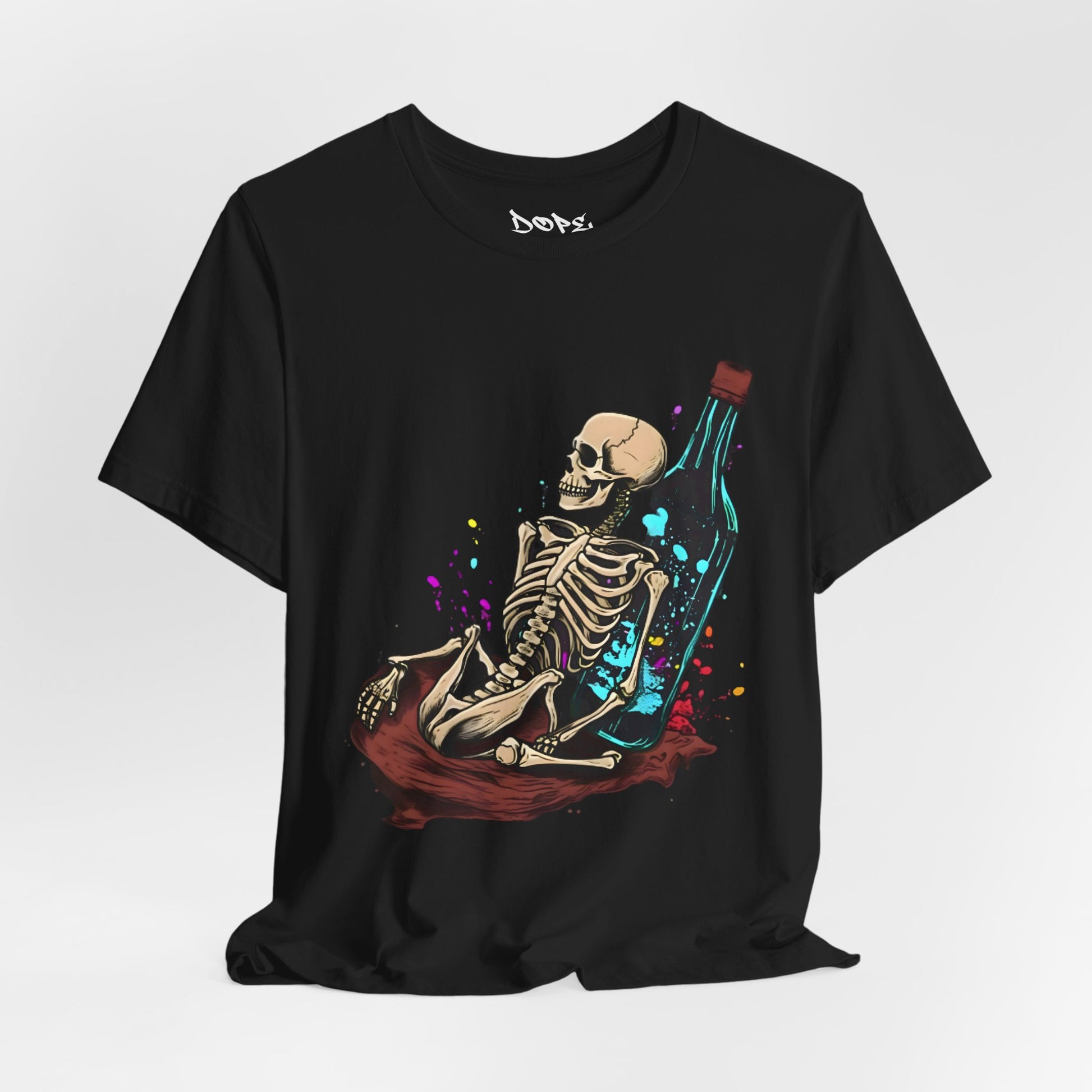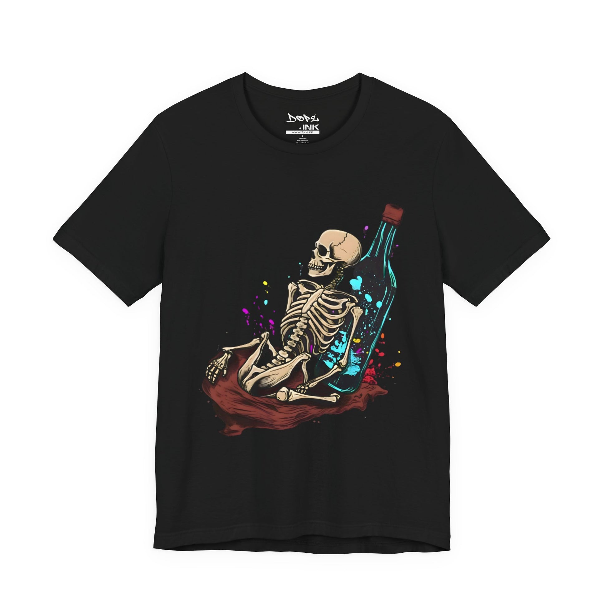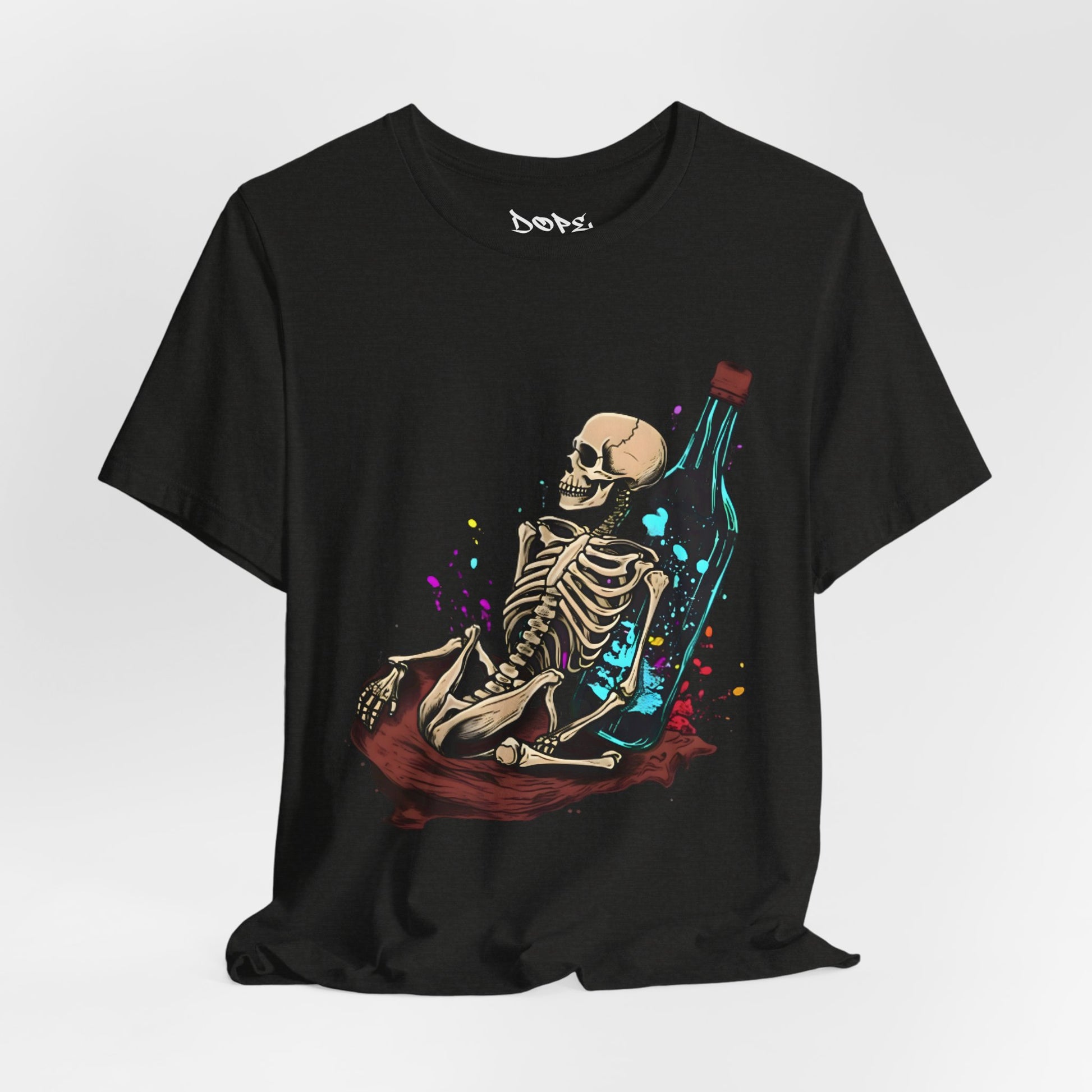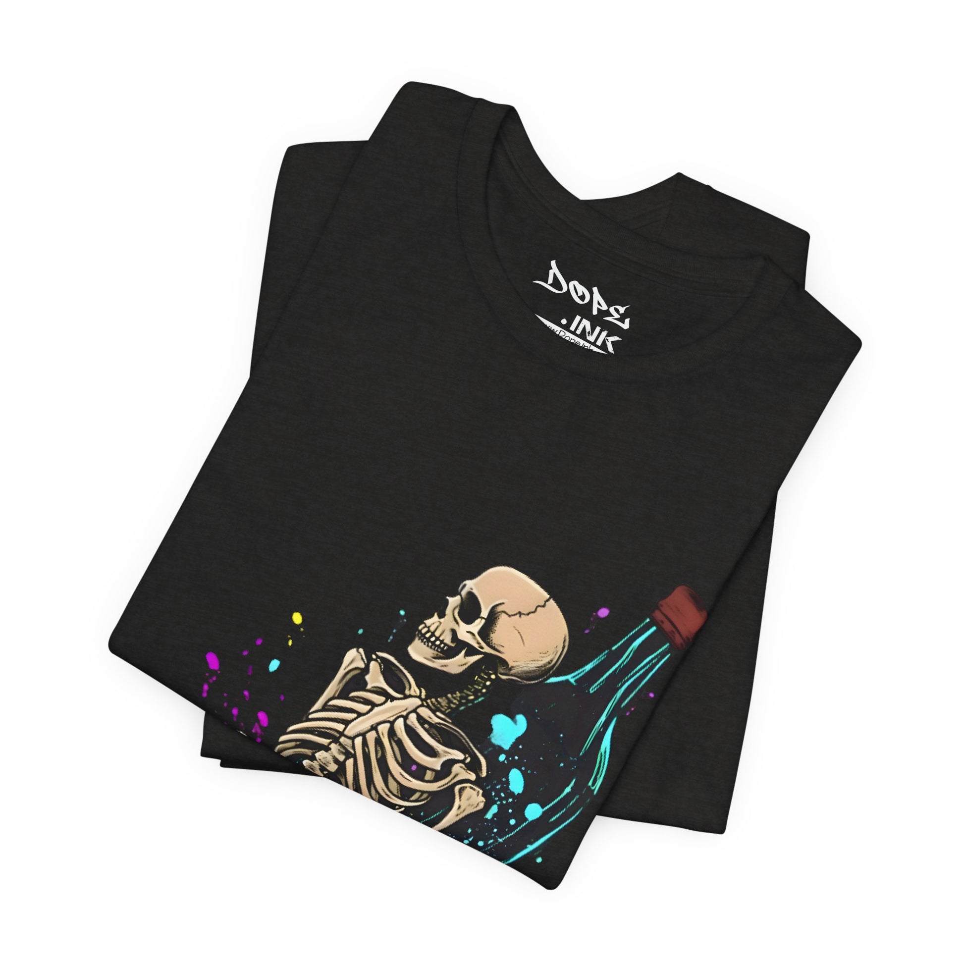 Raise a glass to the afterlife with our "Eternal Toast" Streetwear from Dope.Ink! This premium unisex short-sleeve piece shows a chill skeleton lounging against a massive glowing bottle, surrounded by colorful splashes of cosmic vibes—perfect for night owls, party rebels, or anyone embracing that dark humor, "live forever" energy on wild nights, chill hangs, or whenever you're feeling immortally sarcastic.