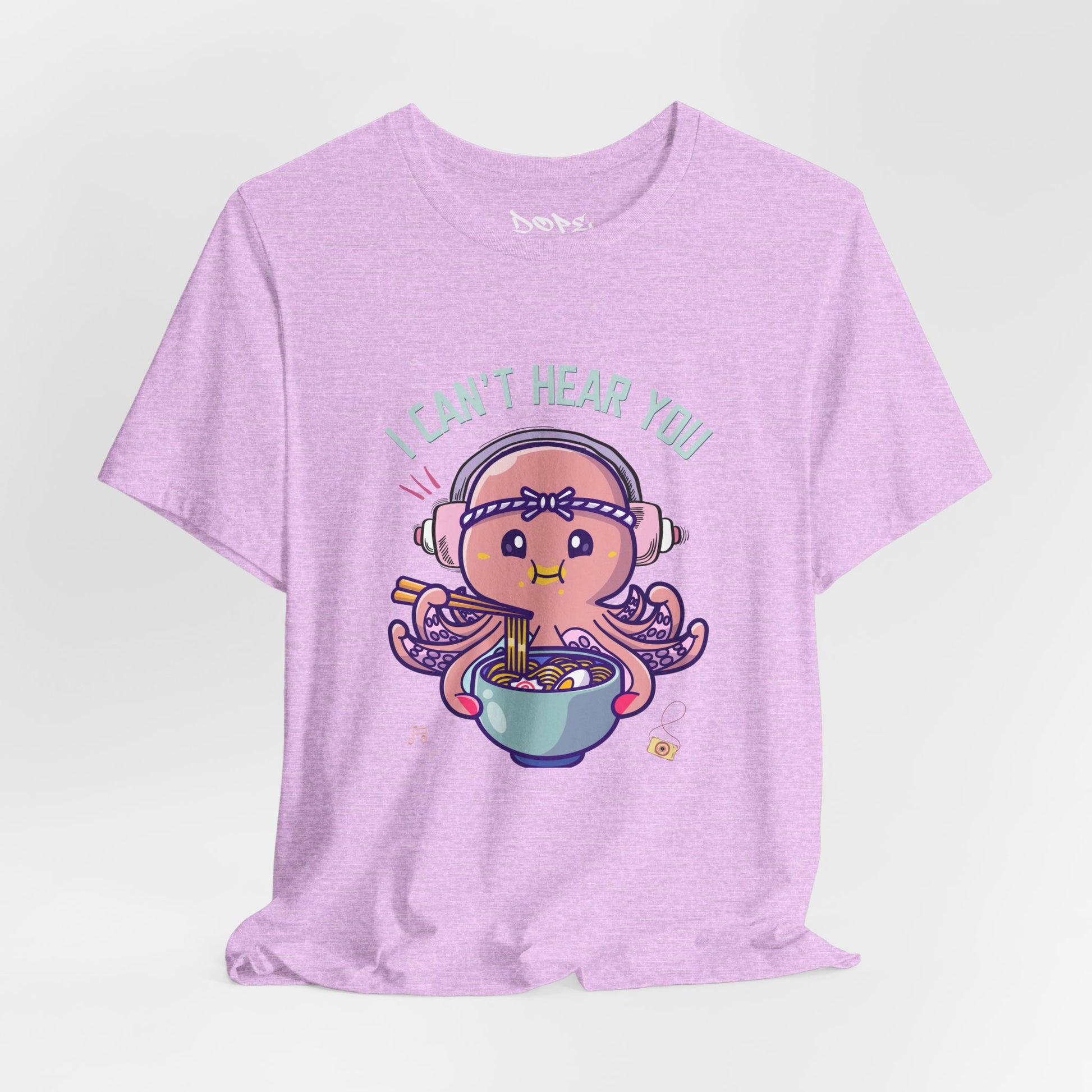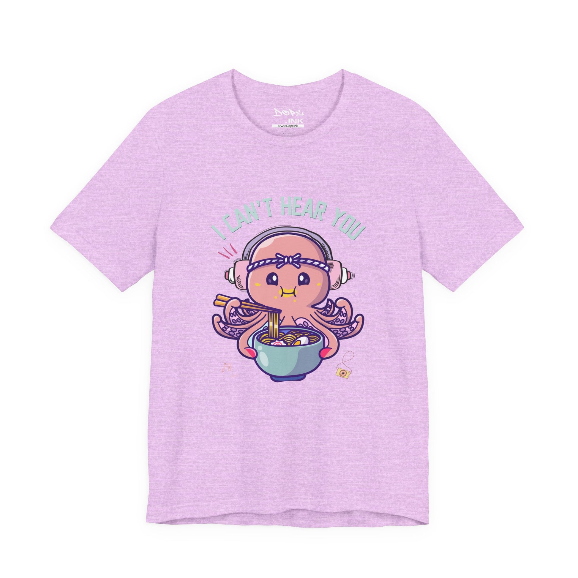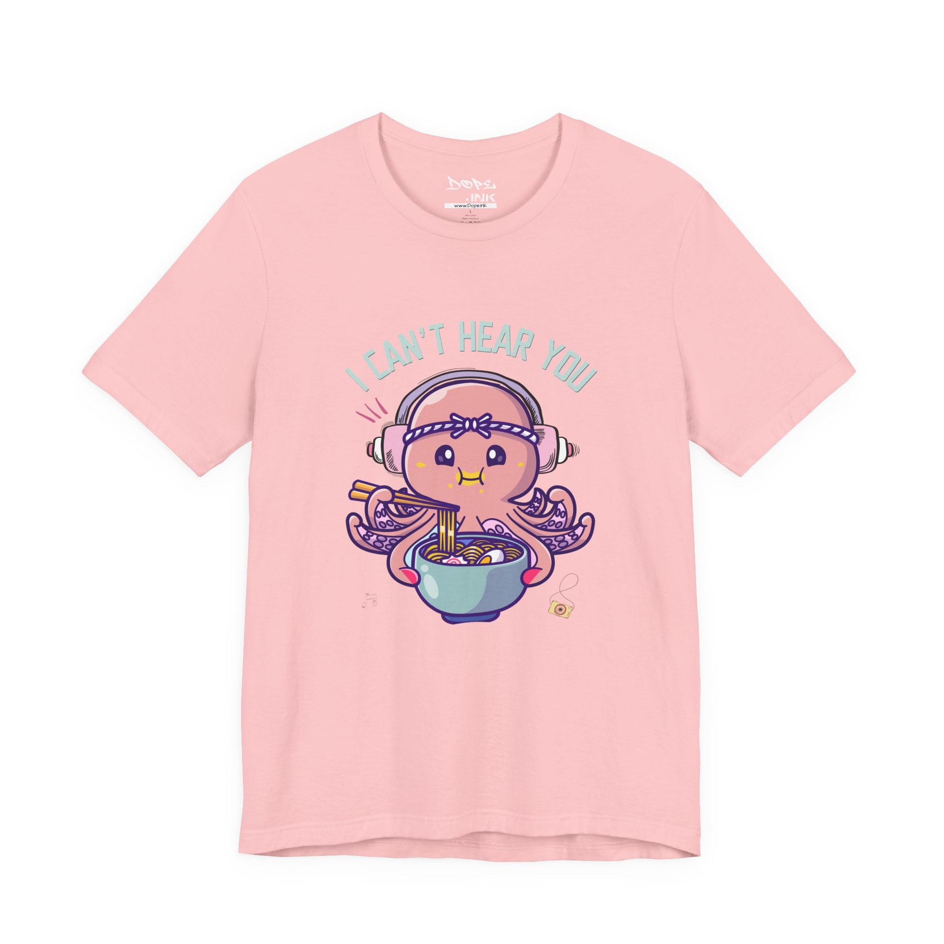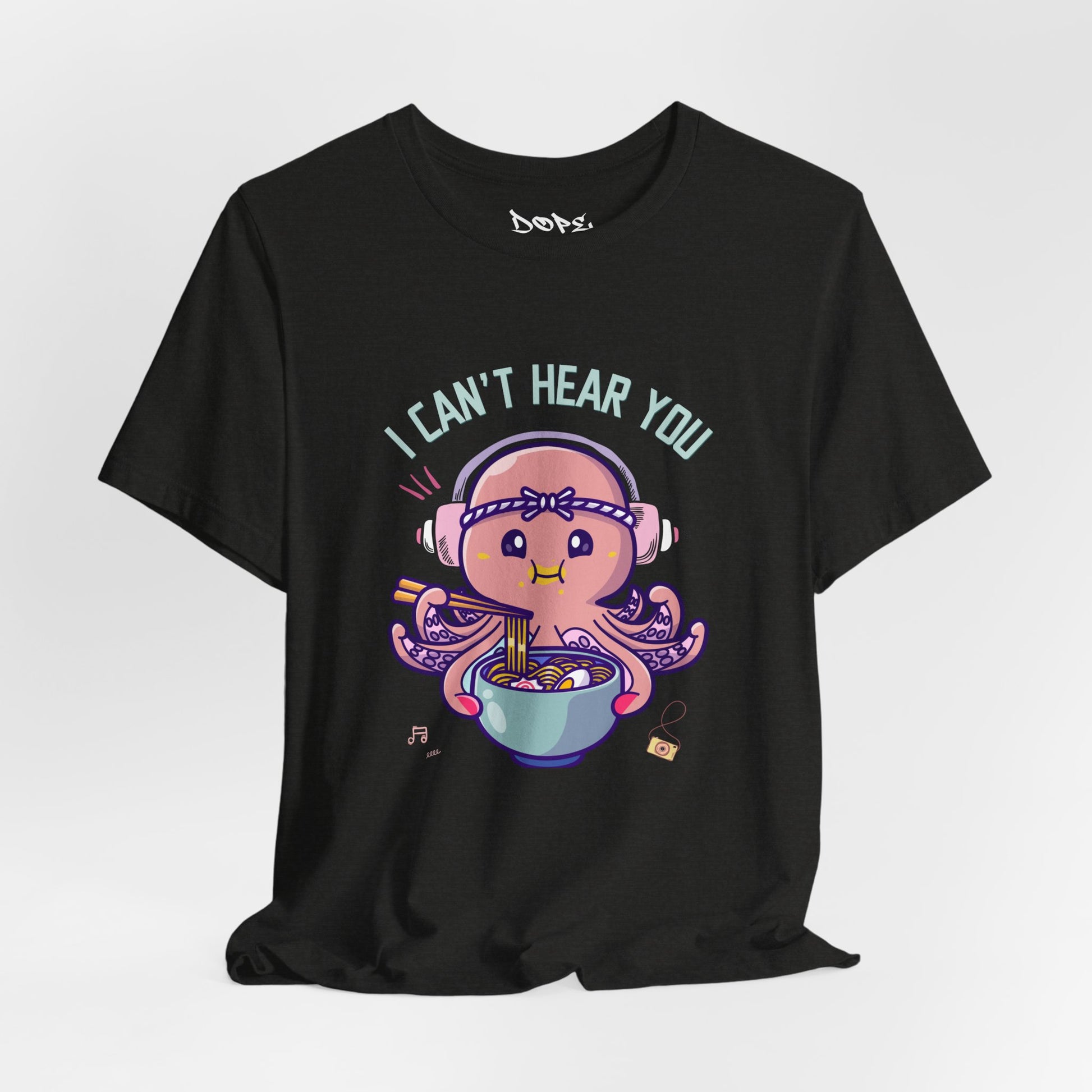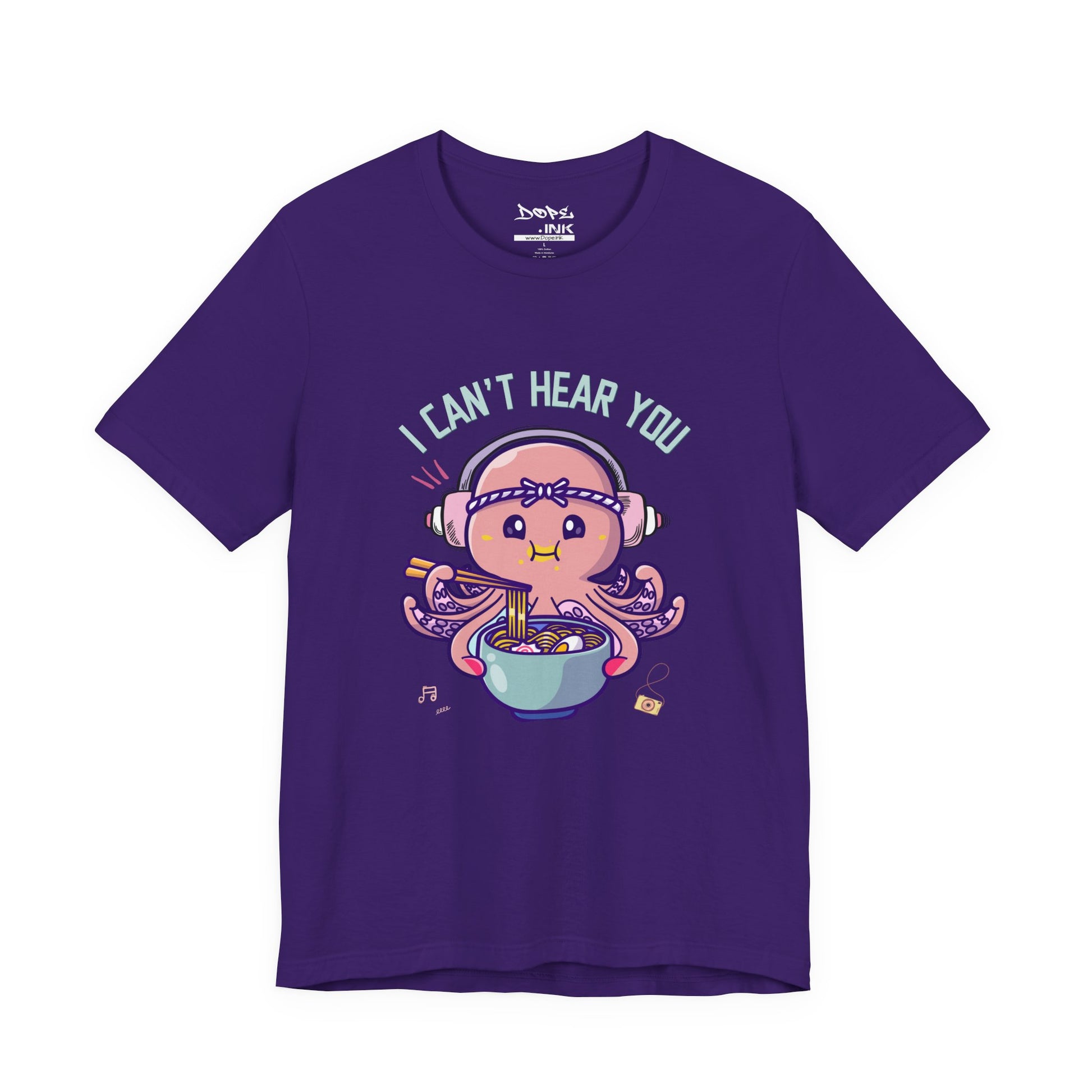 Tune out the noise with our "I Can't Hear You!" Streetwear from Dope.Ink! This premium unisex short-sleeve piece stars a blissed-out purple octopus rocking oversized headphones and a cute bow, slurping ramen straight from the bowl while ignoring the world—perfect for introverts, ramen addicts, music lovers, or anyone mastering the art of "do not disturb" on commutes, study sessions, or whenever you just want noodles and tunes in peace.