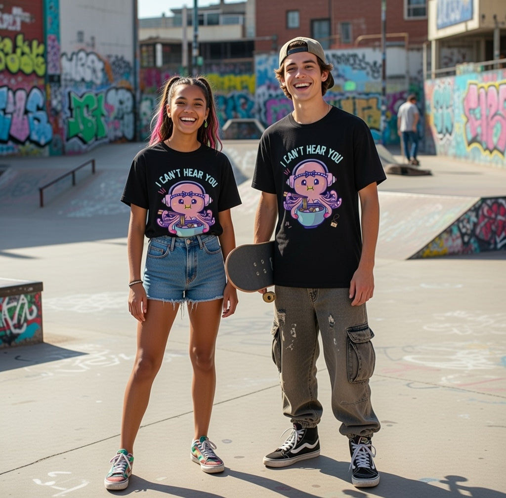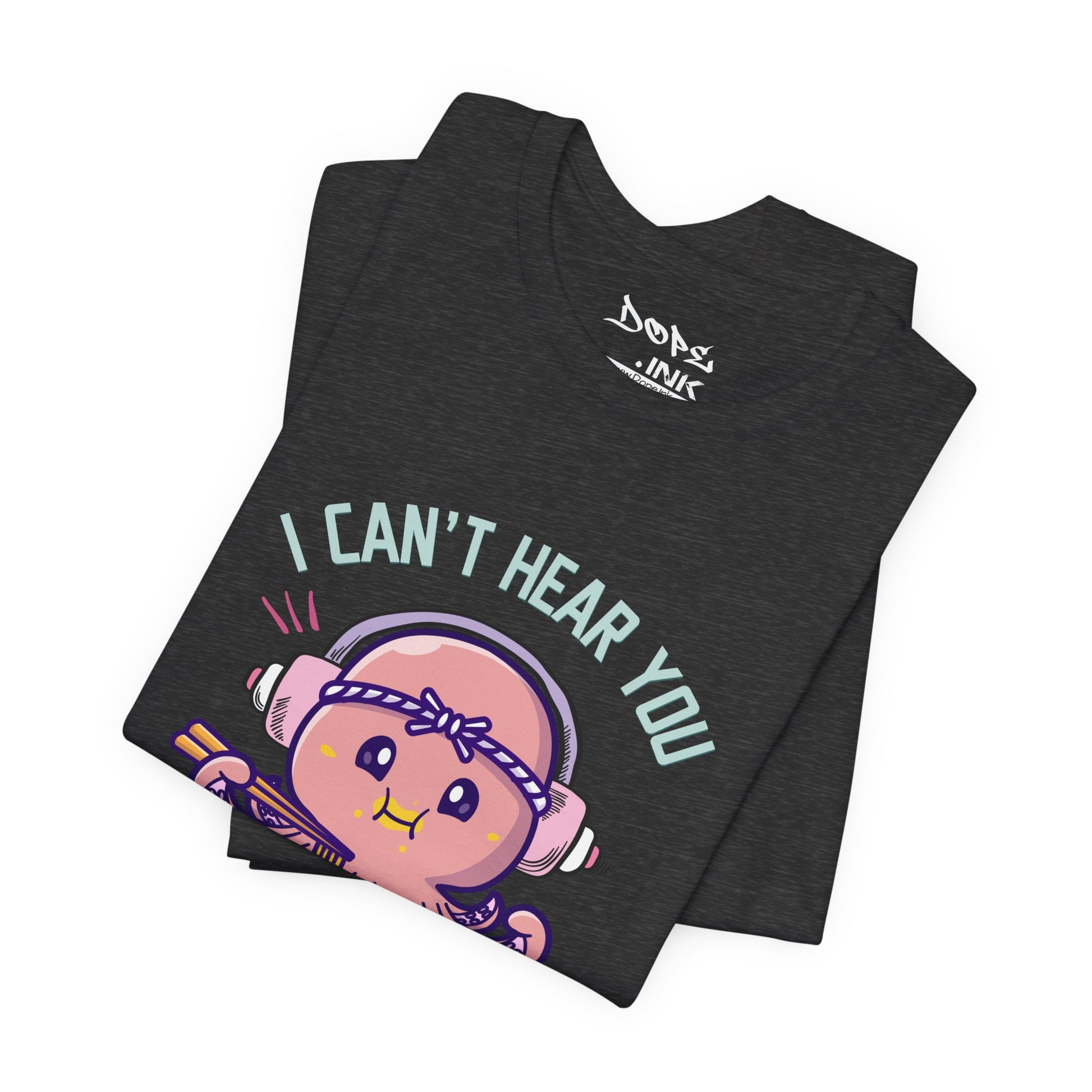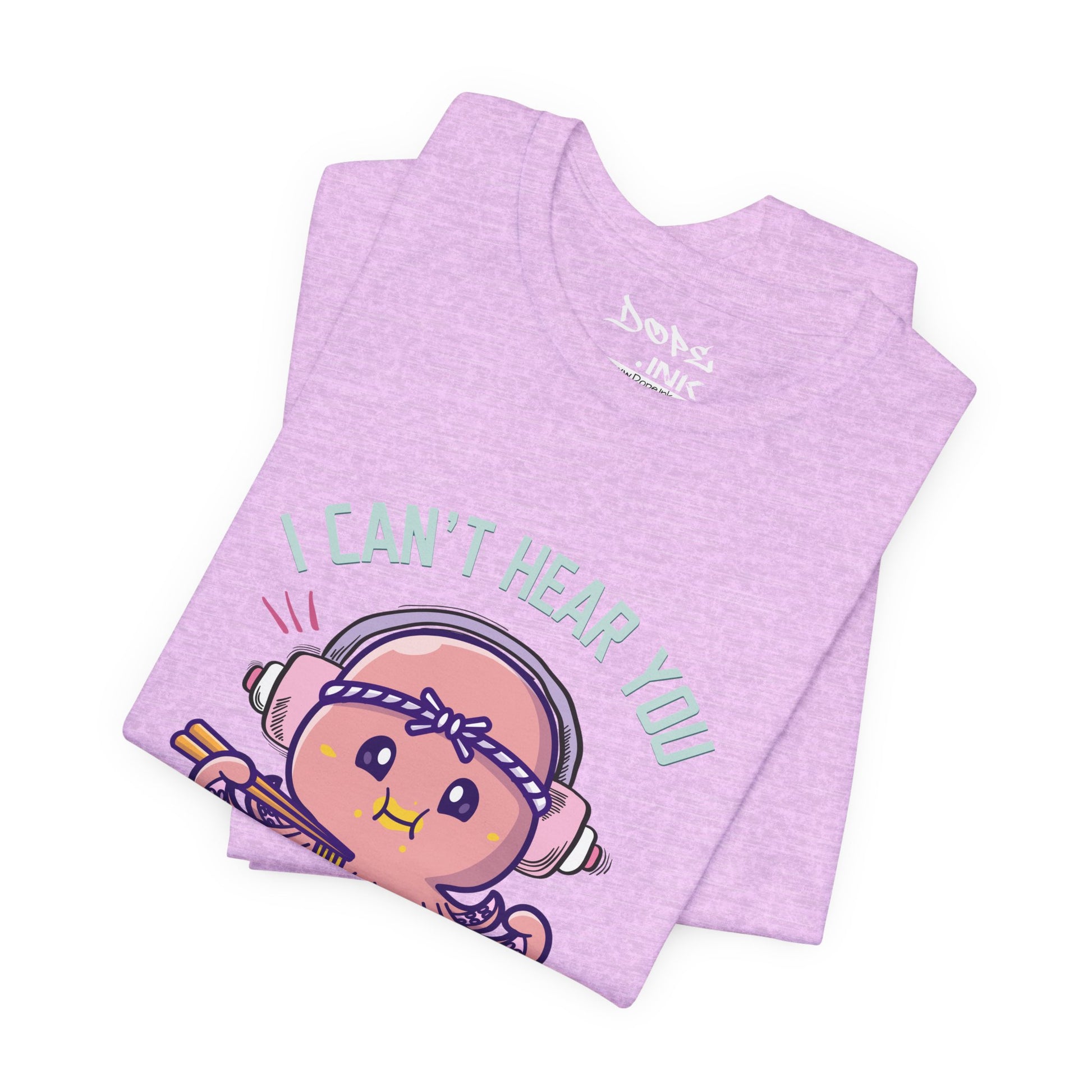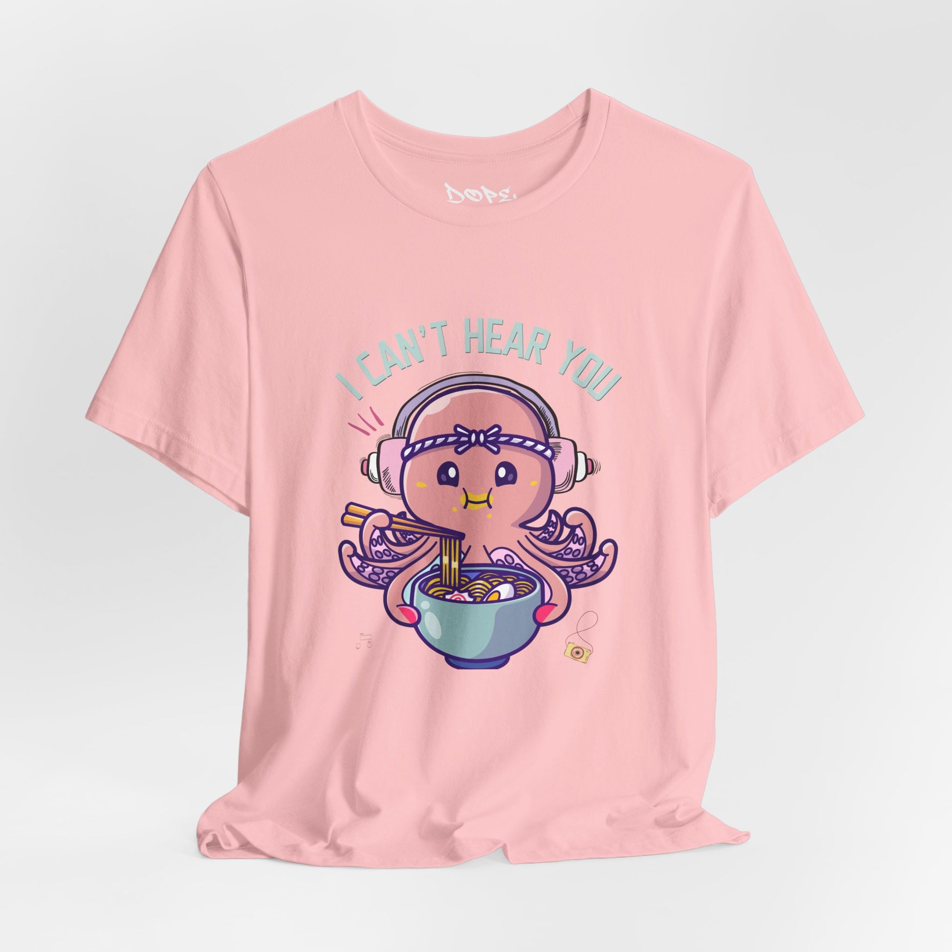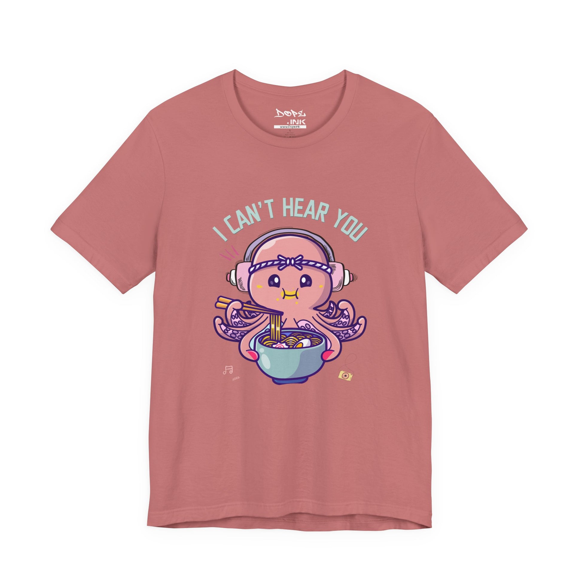 Tune out the noise with our "I Can't Hear You!" Streetwear from Dope.Ink! This premium unisex short-sleeve piece stars a blissed-out purple octopus rocking oversized headphones and a cute bow, slurping ramen straight from the bowl while ignoring the world—perfect for introverts, ramen addicts, music lovers, or anyone mastering the art of "do not disturb" on commutes, study sessions, or whenever you just want noodles and tunes in peace.