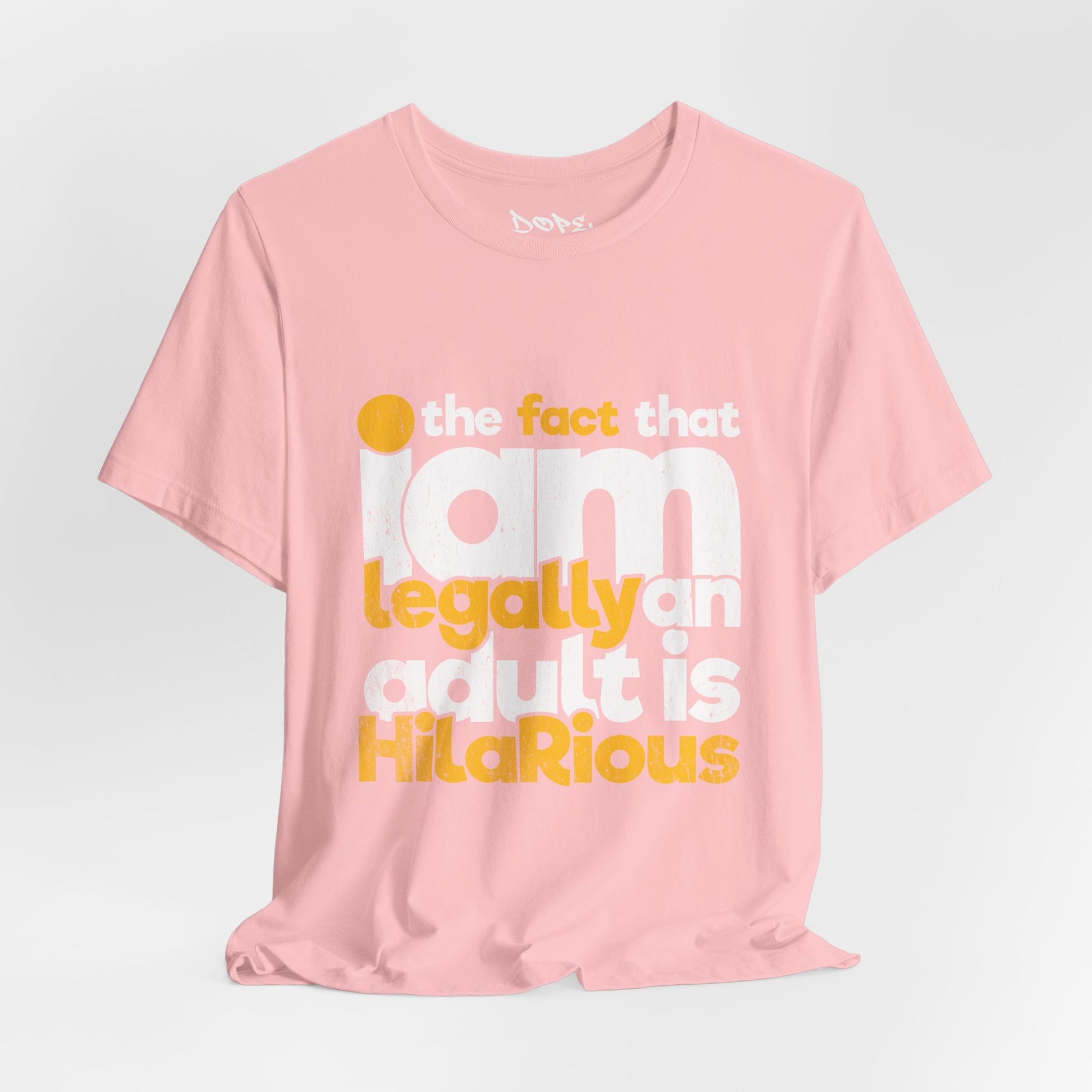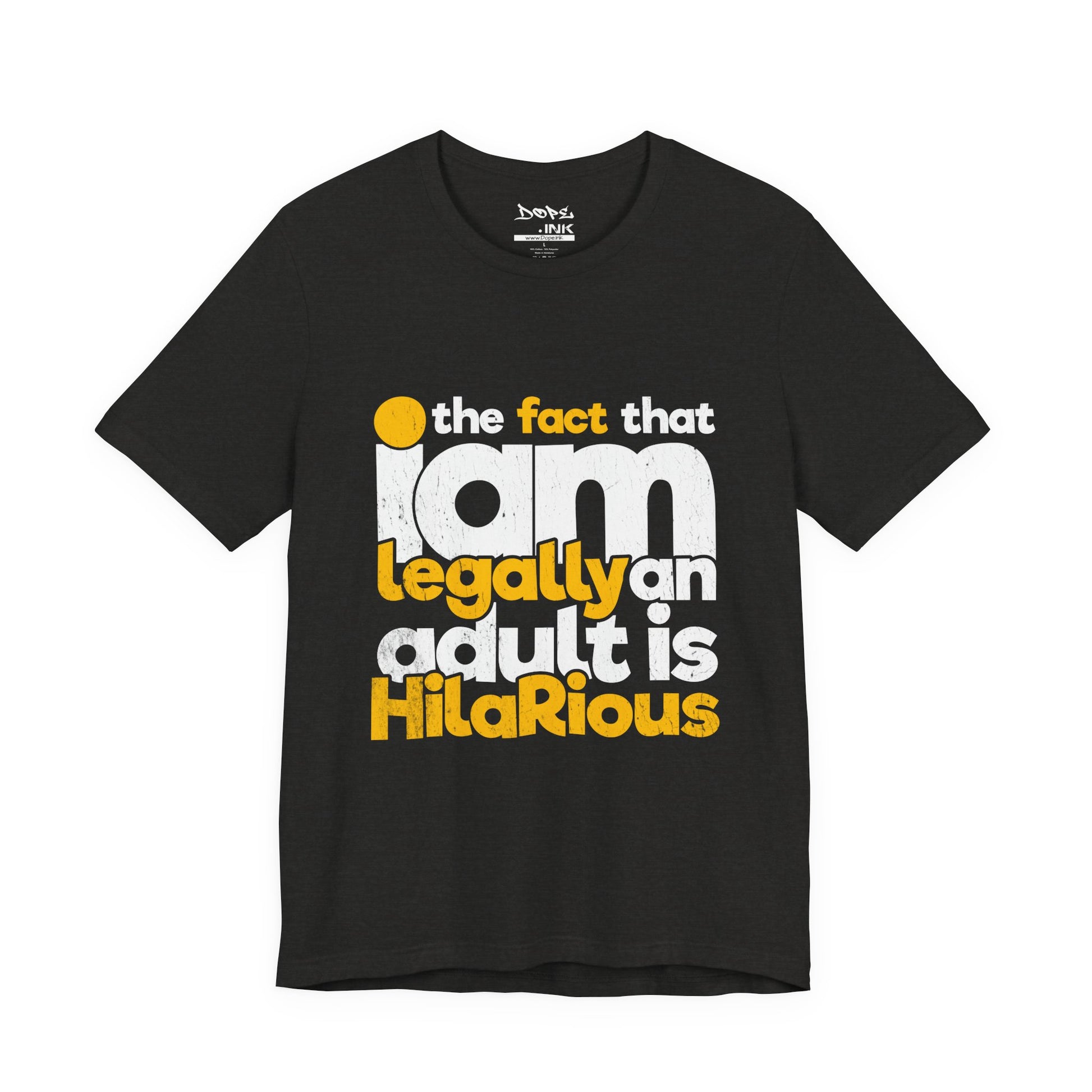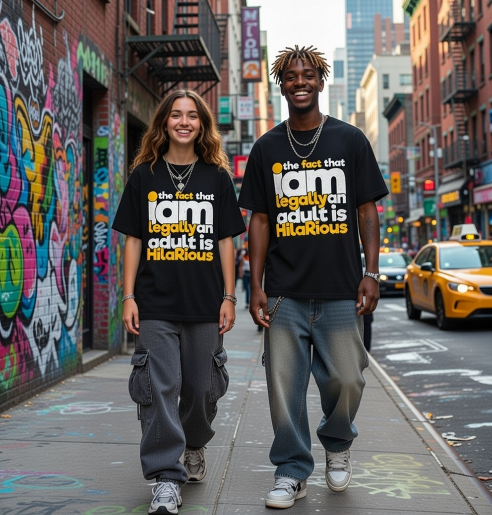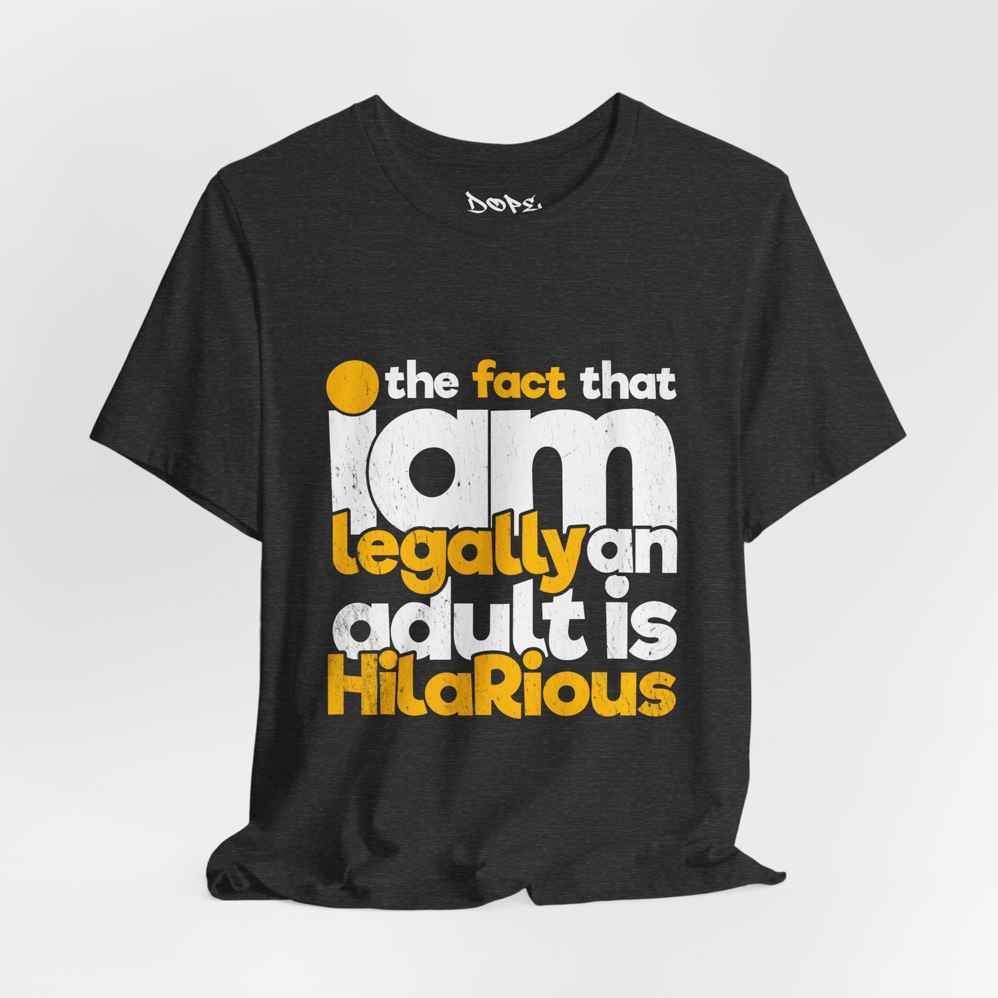 Laugh off adulthood with our "Legally an Adult" Streetwear from Dope.Ink! This premium unisex short-sleeve piece nails the chaos in bold, distressed yellow and white text: "the fact that I am legally an adult is HilaRiouS"—perfect for eternal Peter Pans, responsibility dodgers, millennial/Gen Z survivors, or anyone cracking up at bills, taxes, and "grown-up" life on birthdays, hangovers, or whenever reality hits a little too hard.