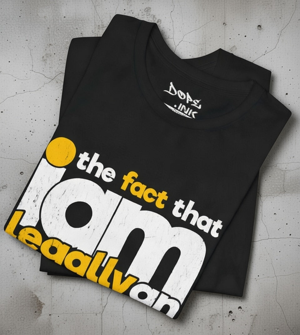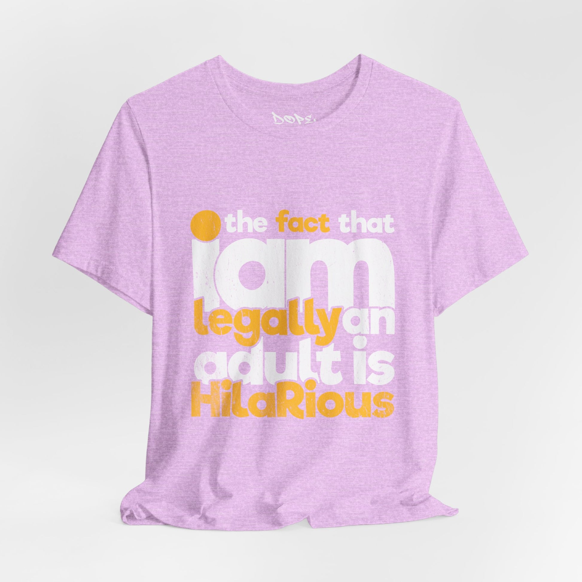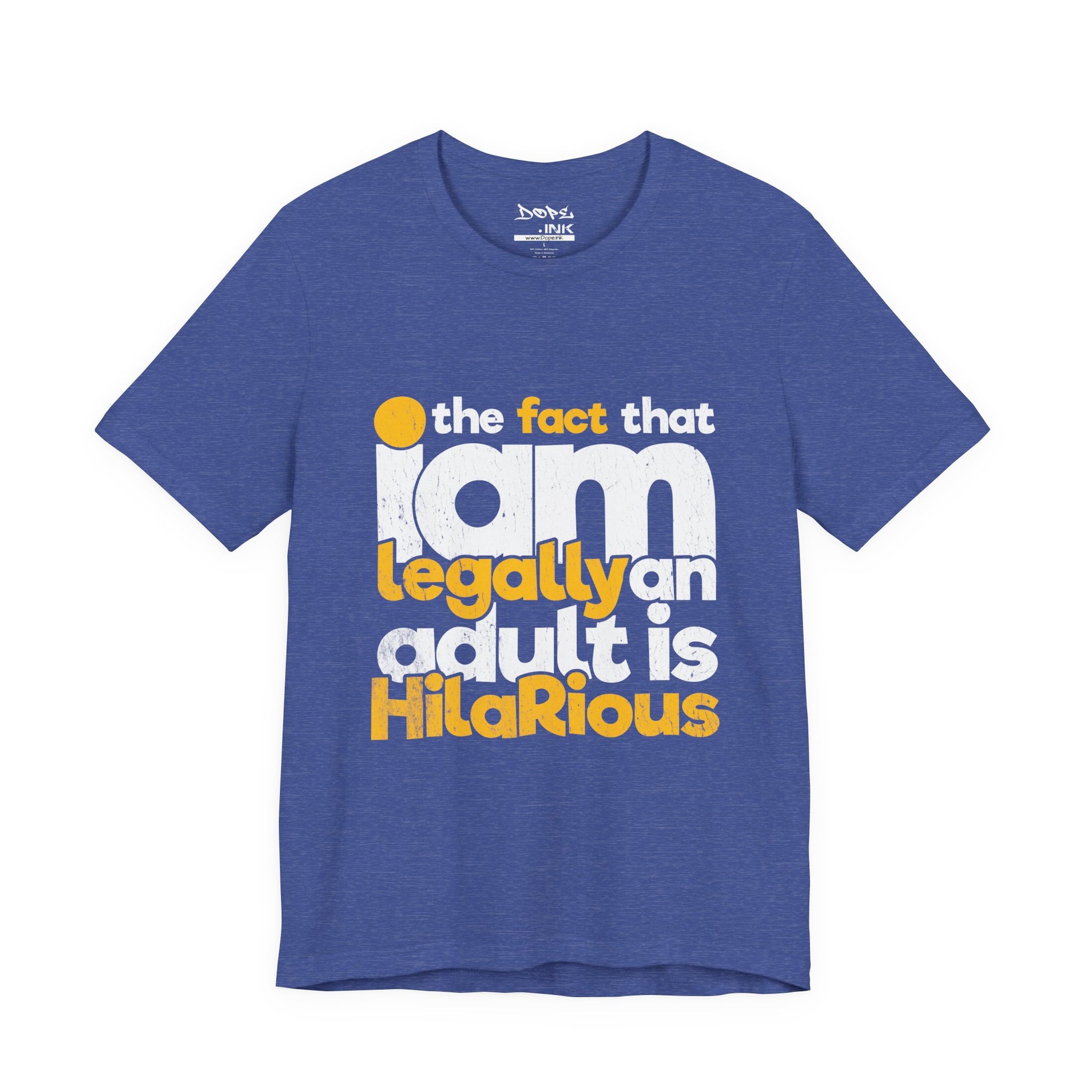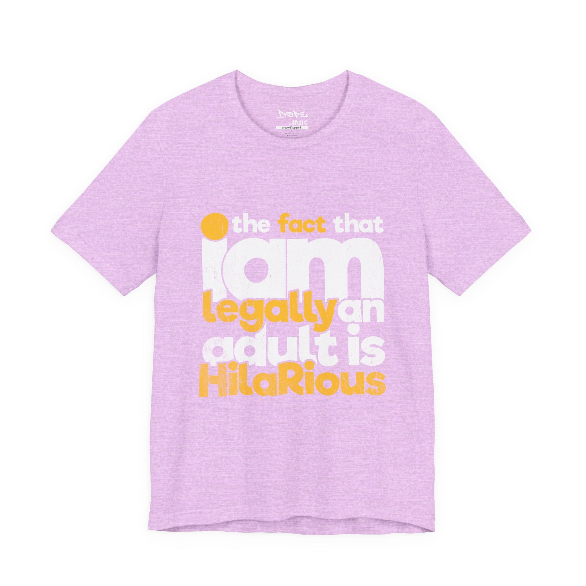 Laugh off adulthood with our "Legally an Adult" Streetwear from Dope.Ink! This premium unisex short-sleeve piece nails the chaos in bold, distressed yellow and white text: "the fact that I am legally an adult is HilaRiouS"—perfect for eternal Peter Pans, responsibility dodgers, millennial/Gen Z survivors, or anyone cracking up at bills, taxes, and "grown-up" life on birthdays, hangovers, or whenever reality hits a little too hard.