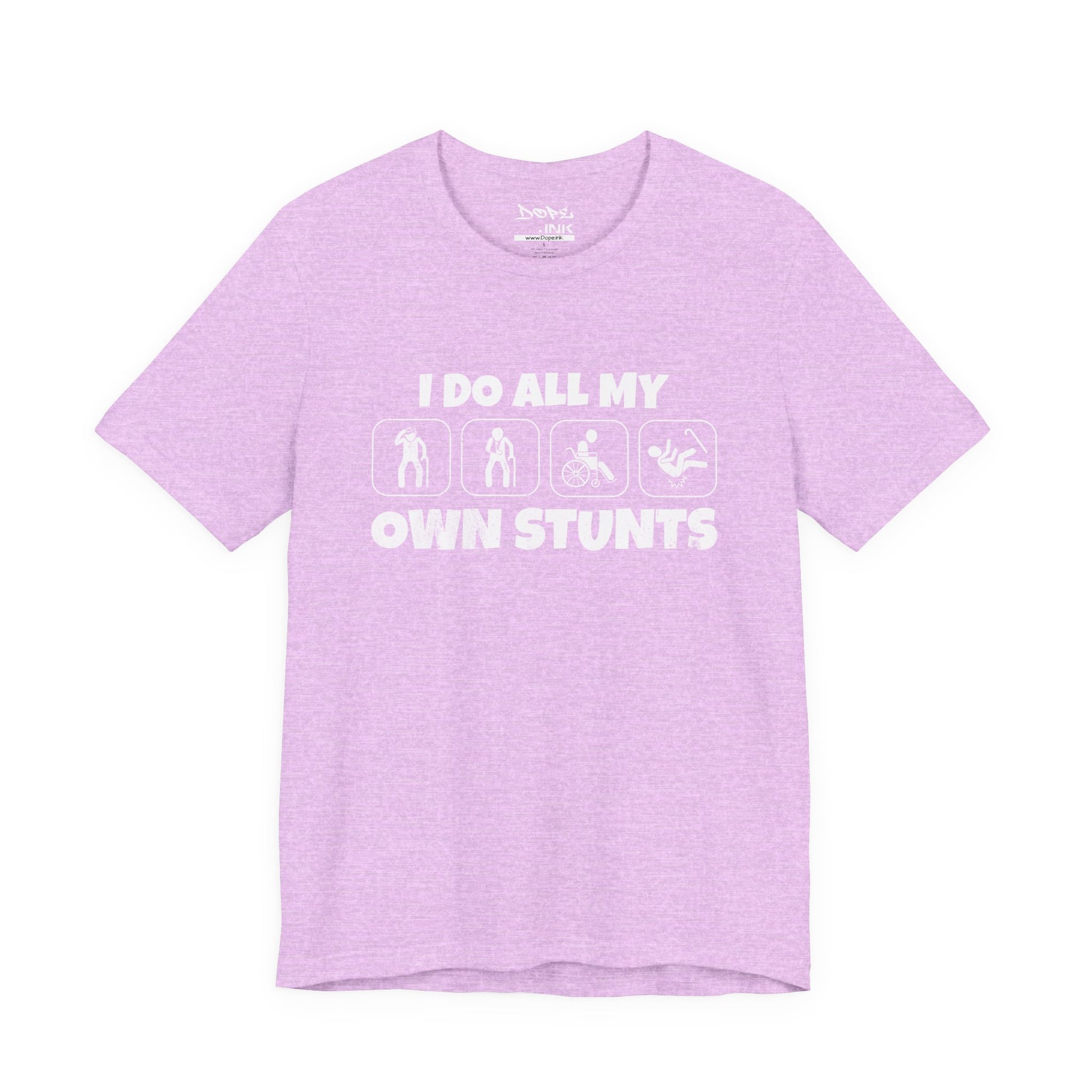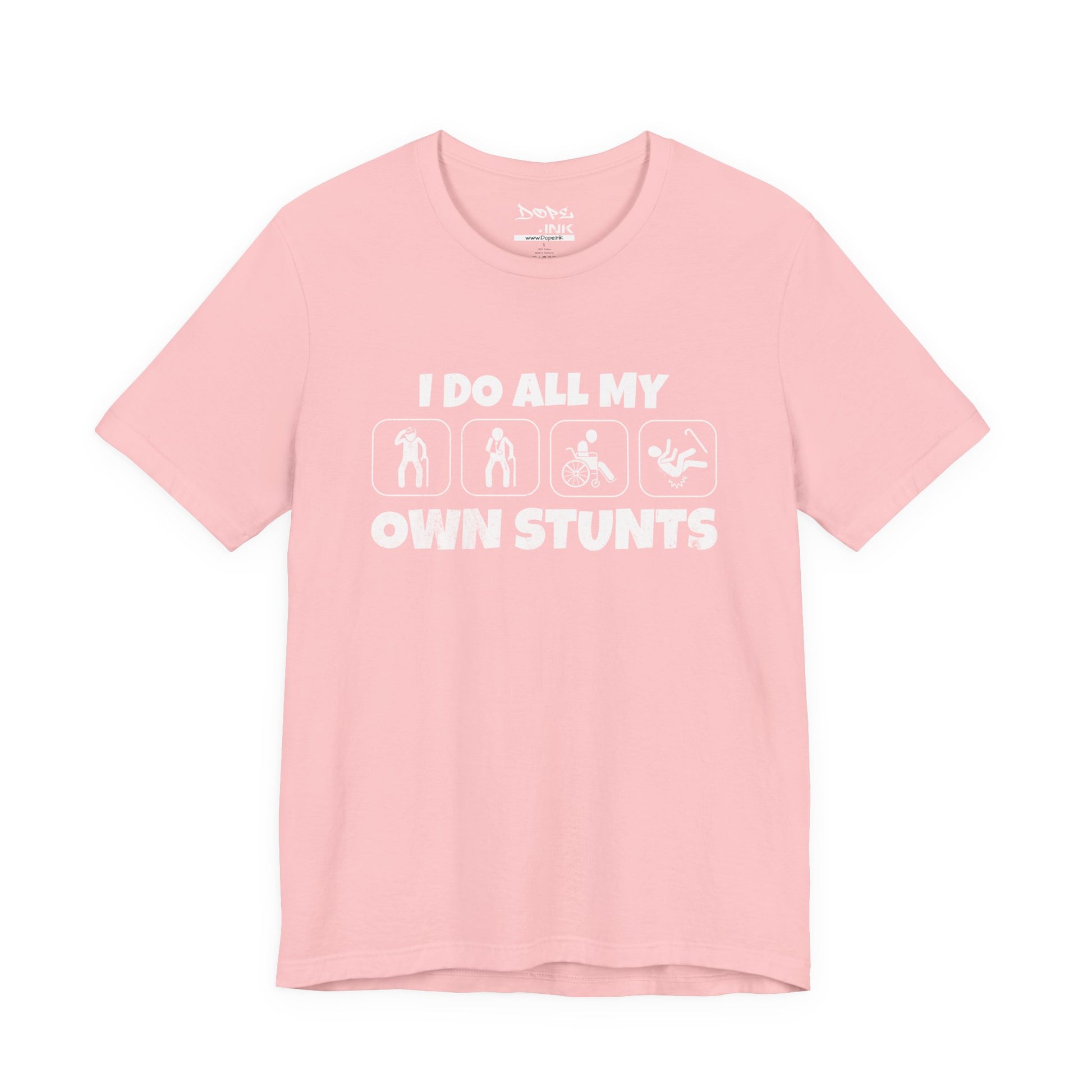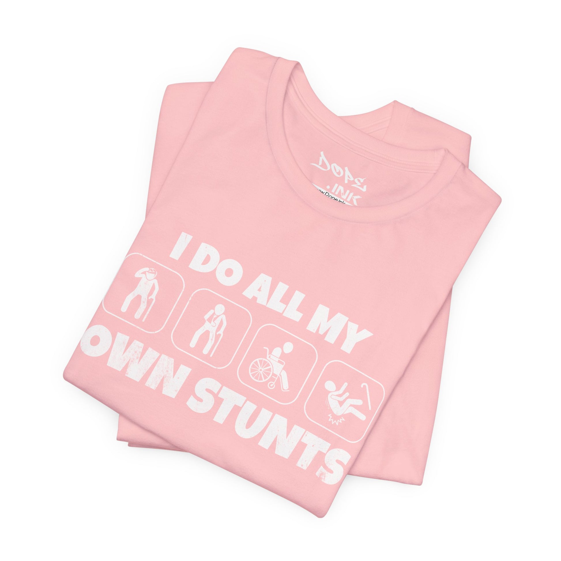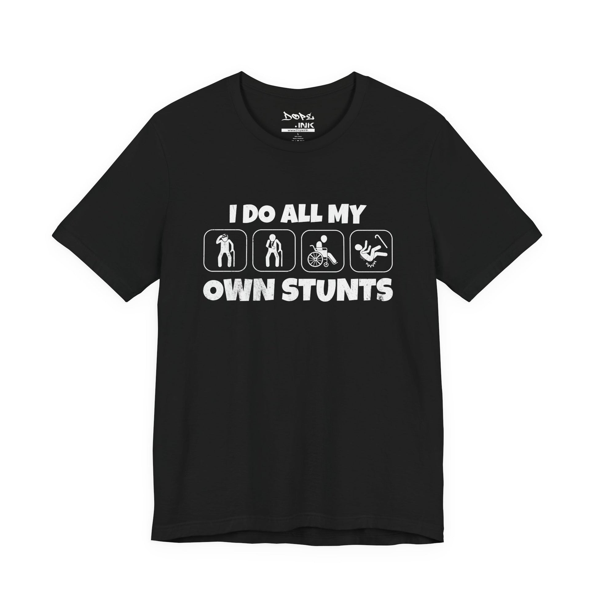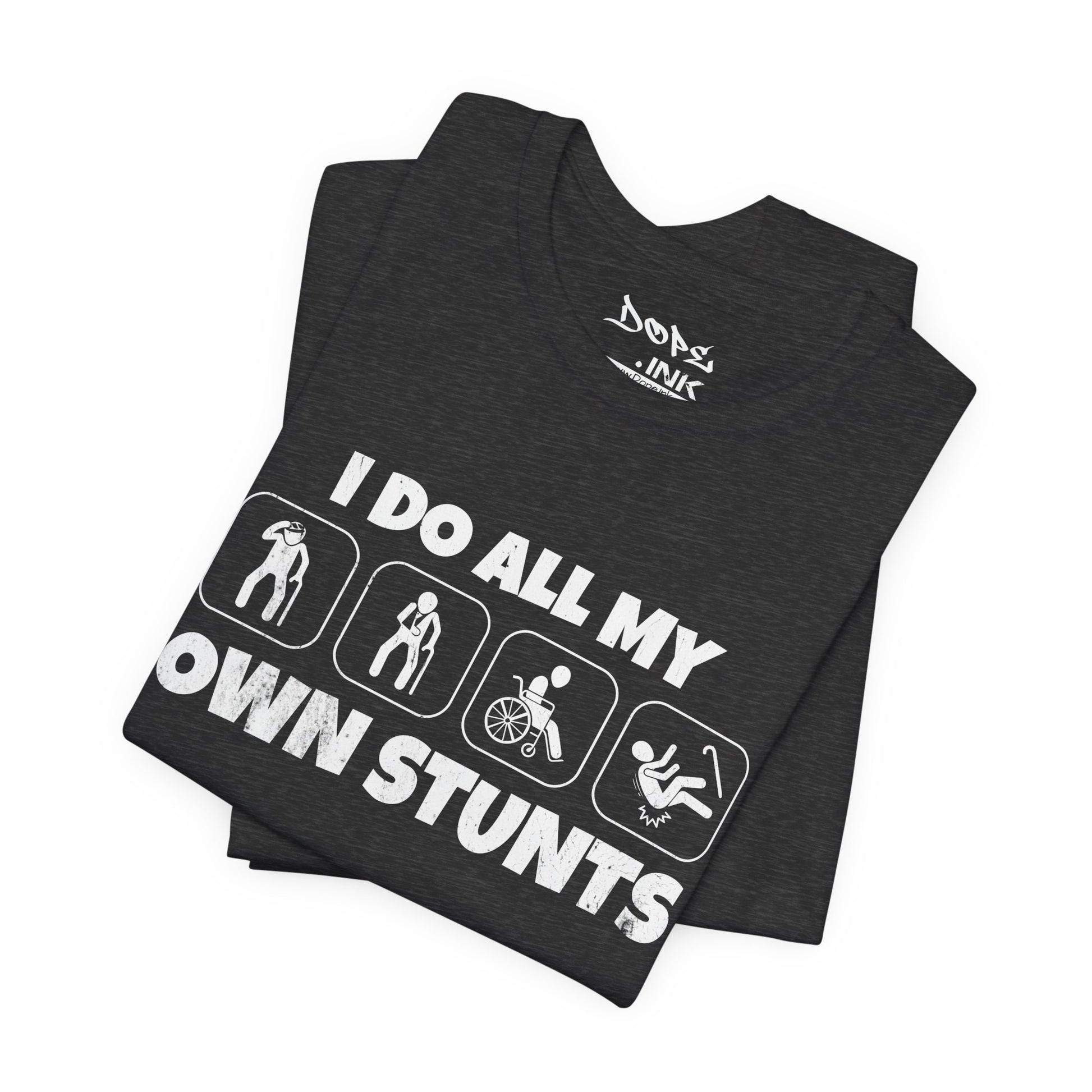Defy the odds with our "I Do All My Own Stunts" Streetwear from Dope.Ink! This premium unisex short-sleeve piece features four bold silhouette icons of a figure walking, falling into a wheelchair, doing a backflip, and crashing hard, paired with the cheeky declaration "I DO ALL MY OWN STUNTS"—perfect for adrenaline junkies, wheelchair warriors, accident-prone legends, or anyone owning their epic fails (and wins) with dark humor and unbreakable spirit on daily adventures, gym sessions, or recovery days.