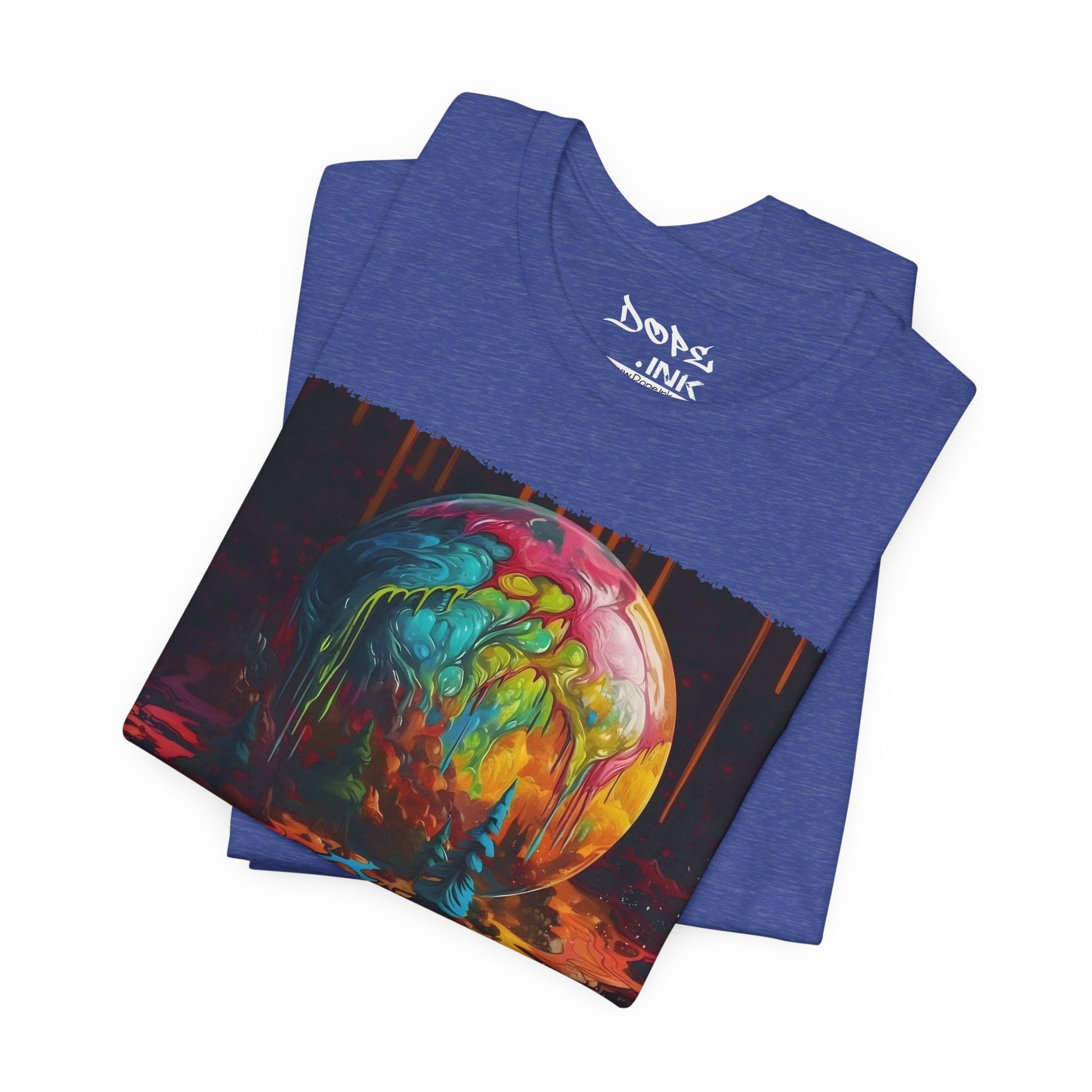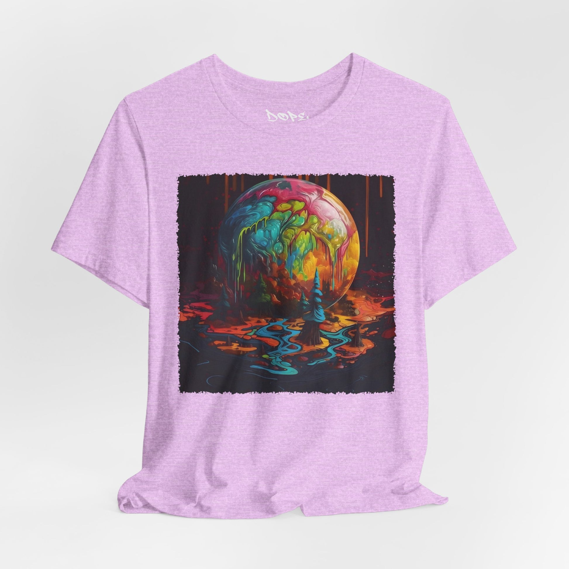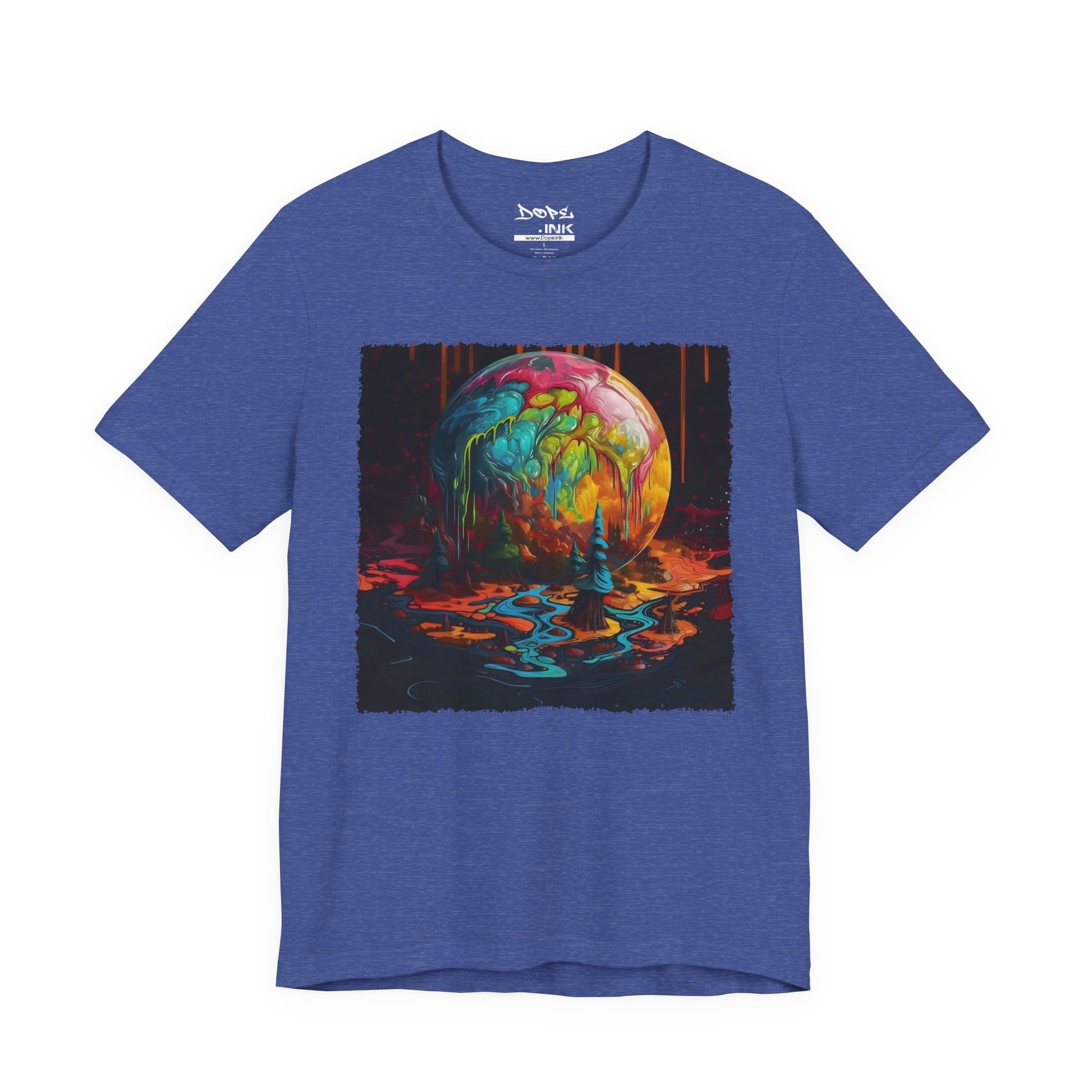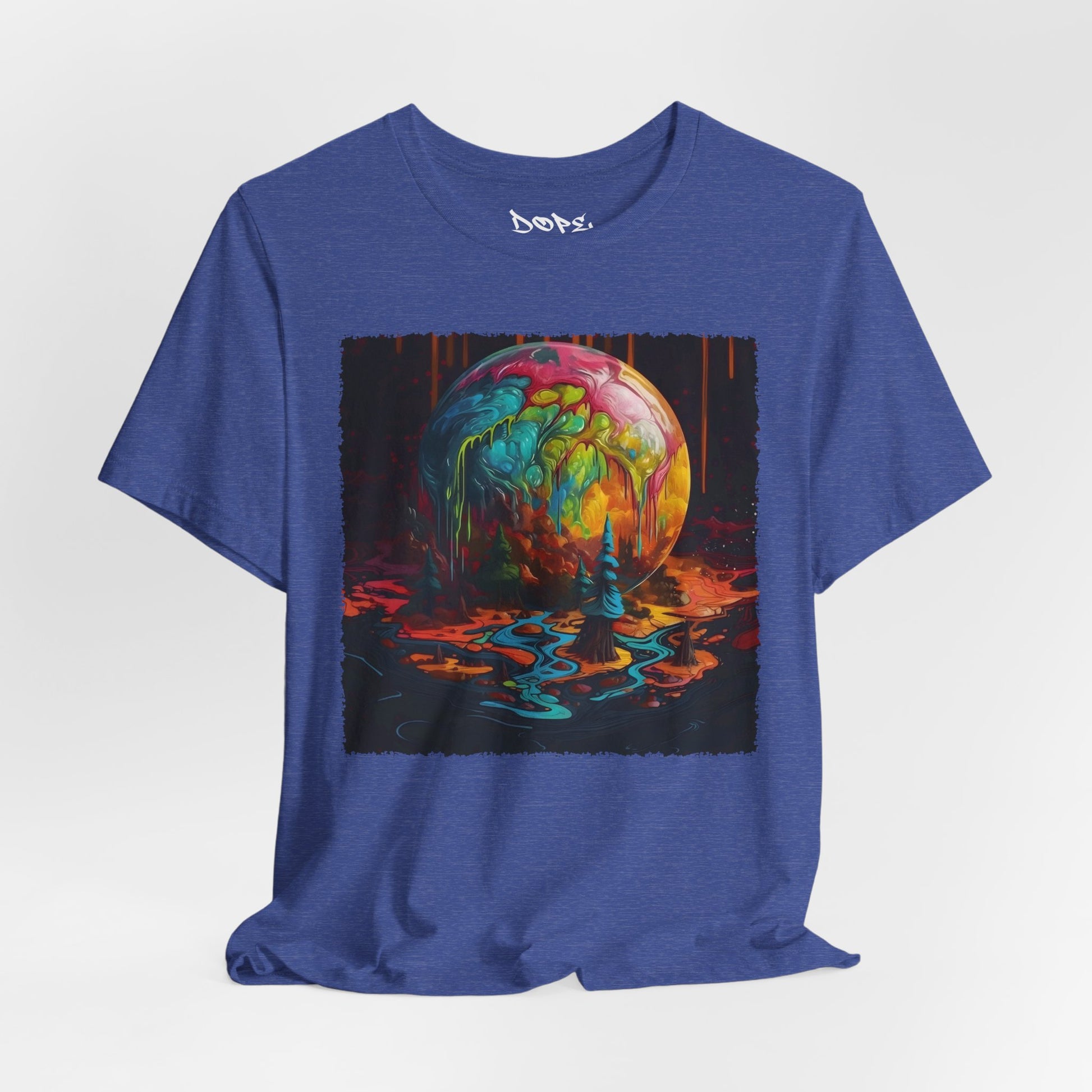 Melt into the surreal with our "Psychedelic Eclipse" Streetwear from Dope.Ink! This premium unisex short-sleeve piece showcases a massive, dripping orb of swirling neon colors—pink, teal, lime, orange, and electric blue—hovering above a warped alien landscape of melting trees and glowing pools. Pure psychedelic rebellion for trippy souls, festival wanderers, or anyone who wants to wear a portal to another dimension on the daily.