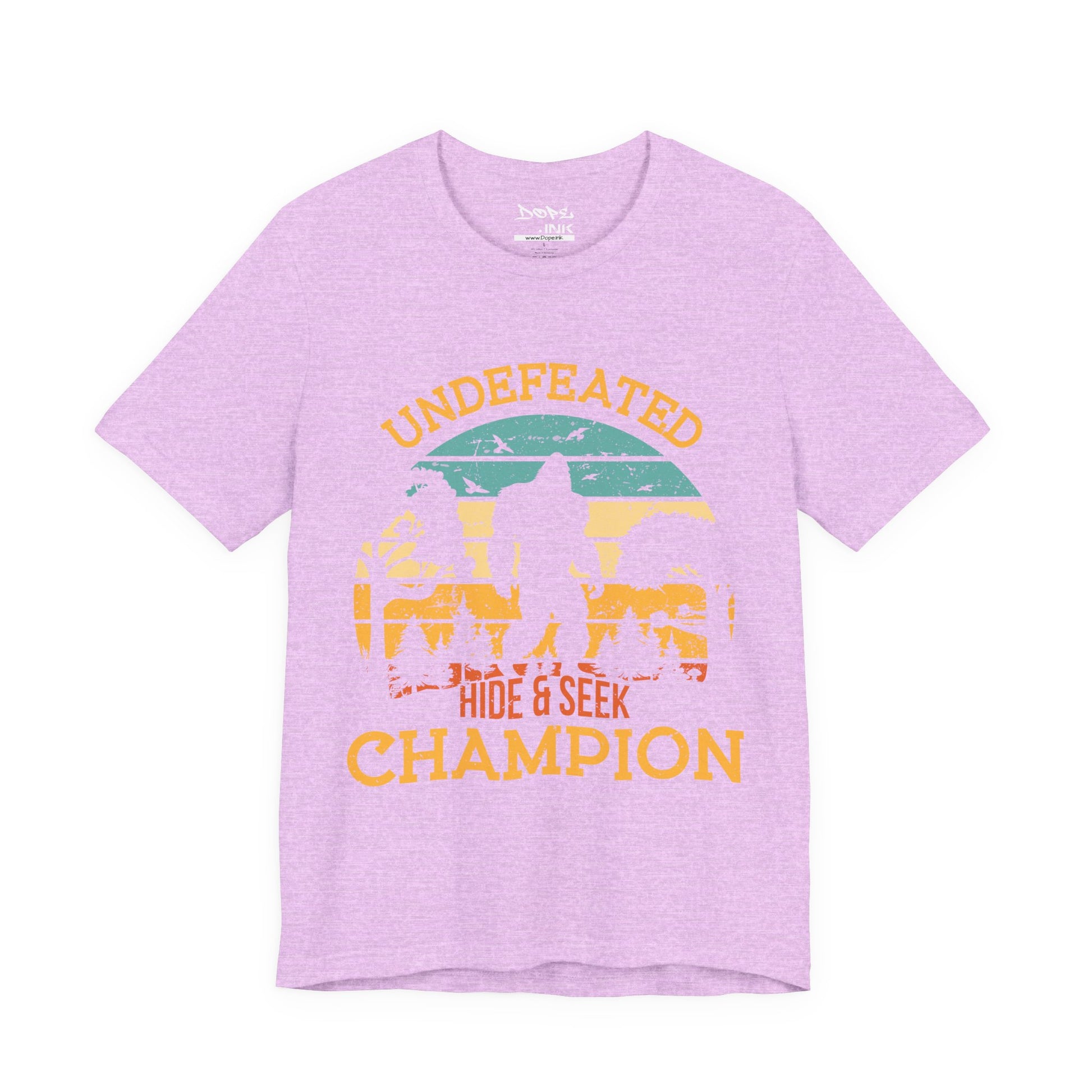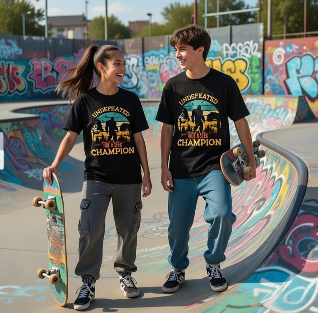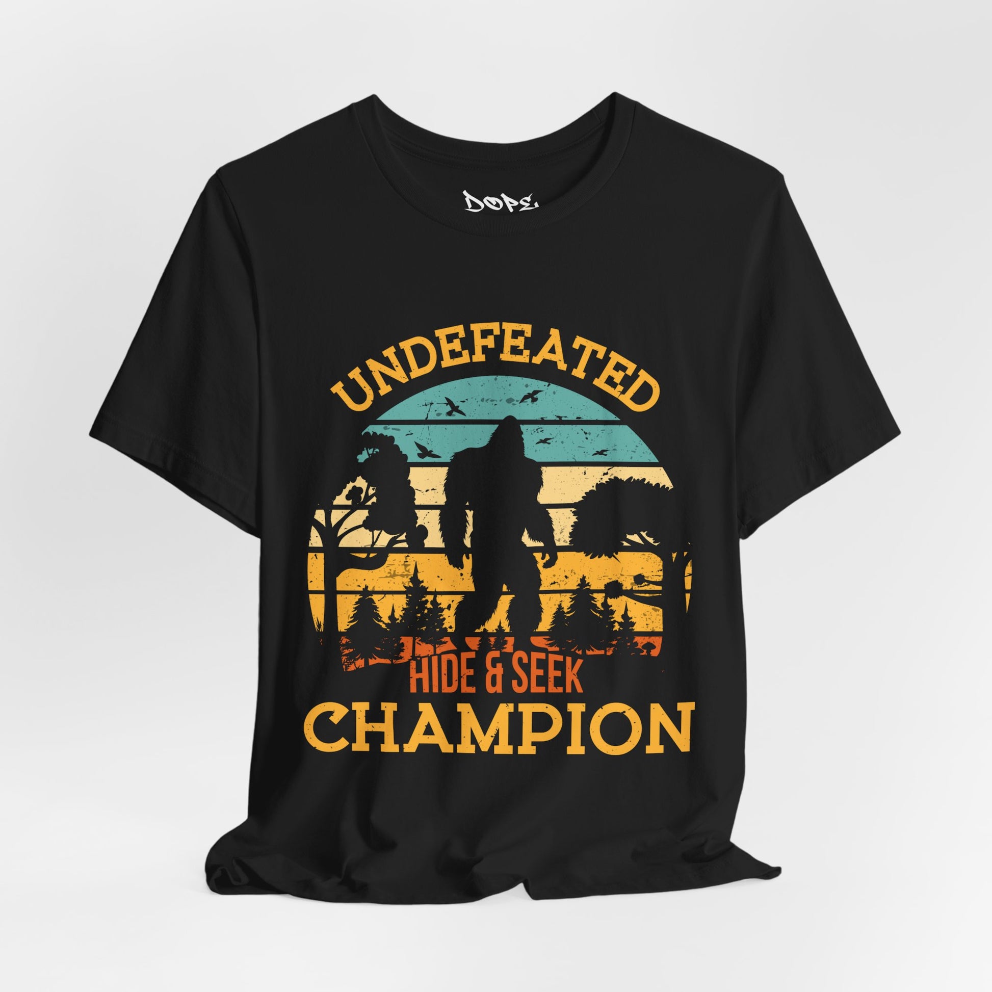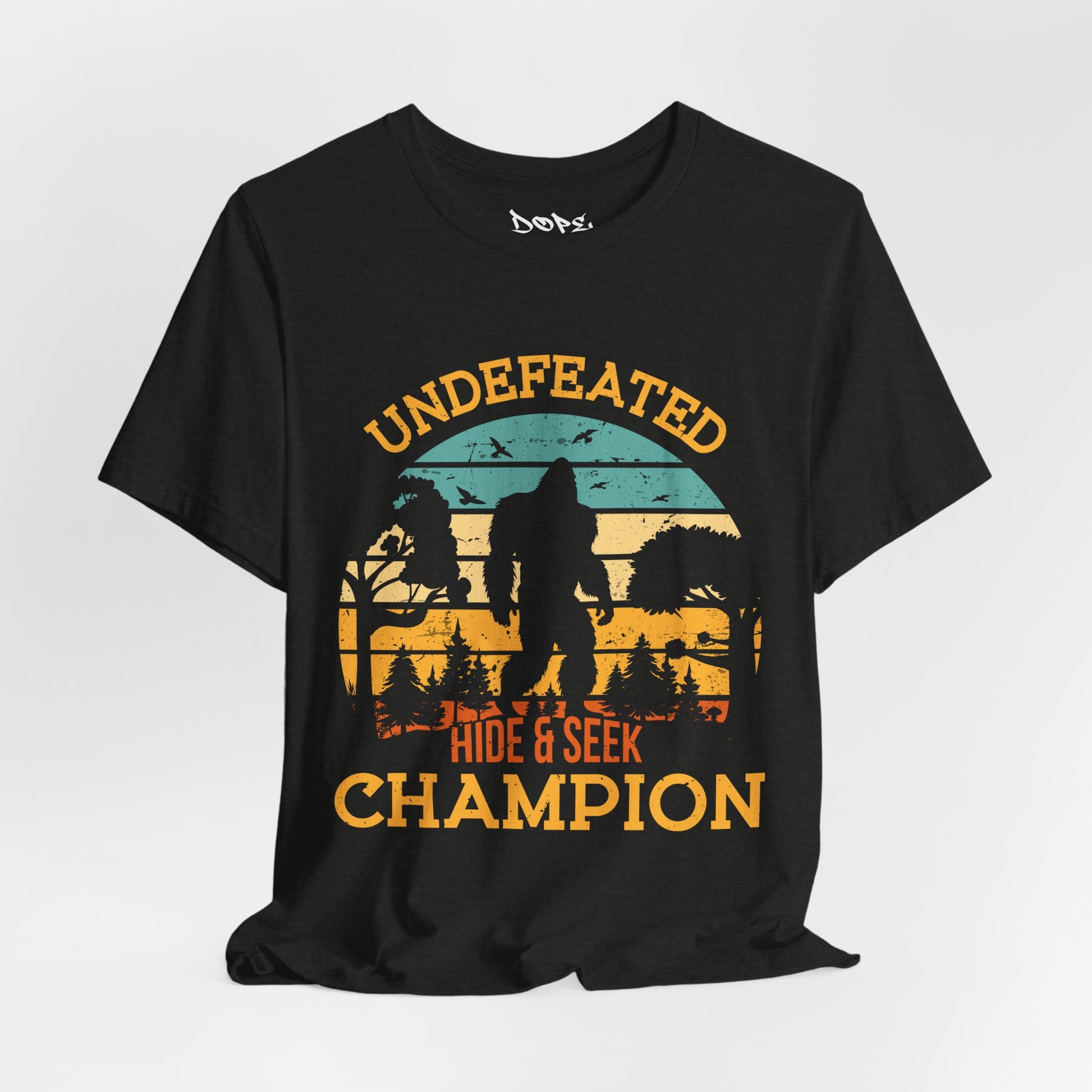 Hide in plain sight with our "Undefeated Hide & Seek Champion" Streetwear from Dope.Ink! This premium unisex short-sleeve piece celebrates the ultimate legend with "UNDEFEATED HIDE & SEEK CHAMPION" arched over a retro sunset silhouette of Bigfoot striding through misty pines—perfect for cryptozoology fans, outdoor rebels, prank masters, or anyone who's mastered vanishing acts on hikes, festivals, or everyday escapades.