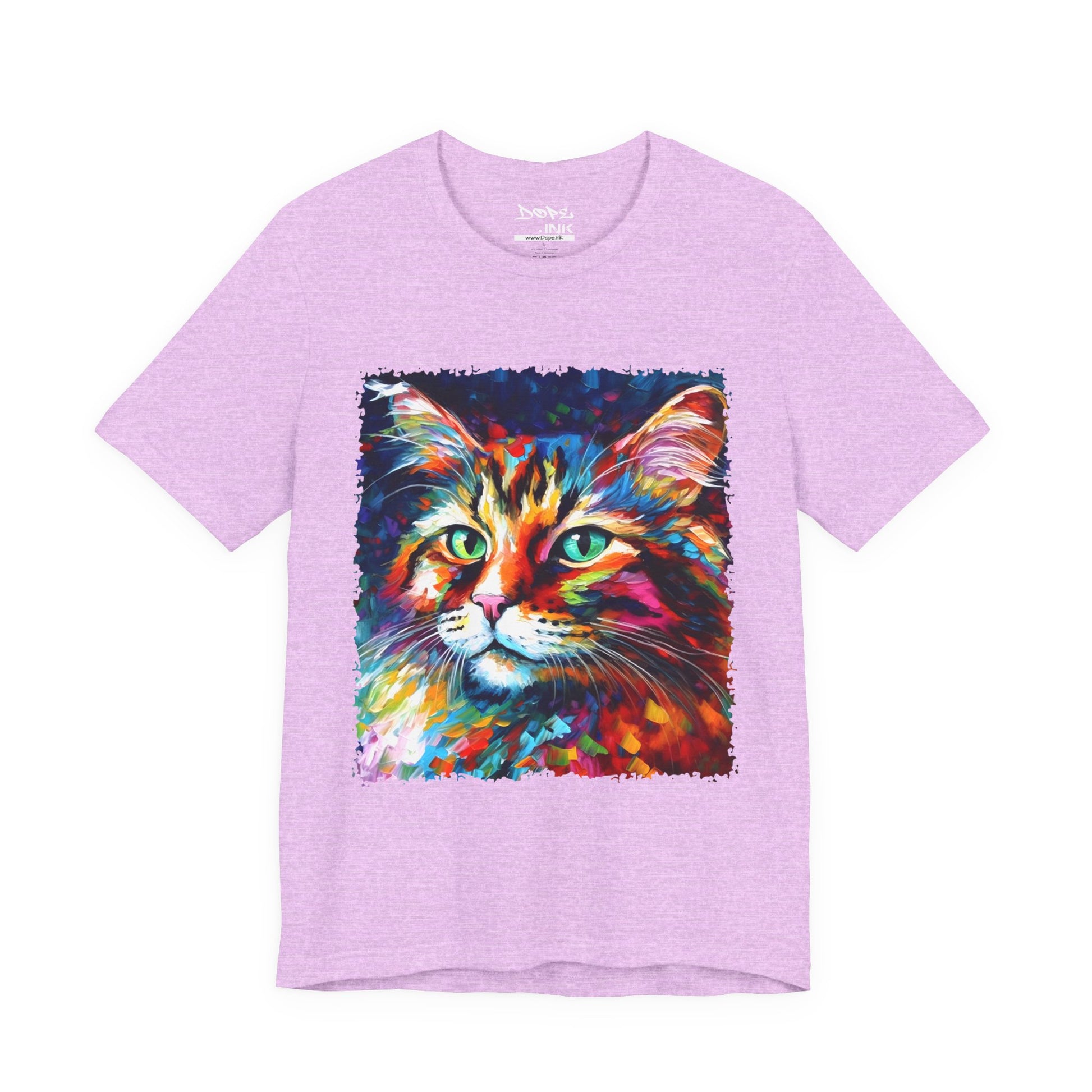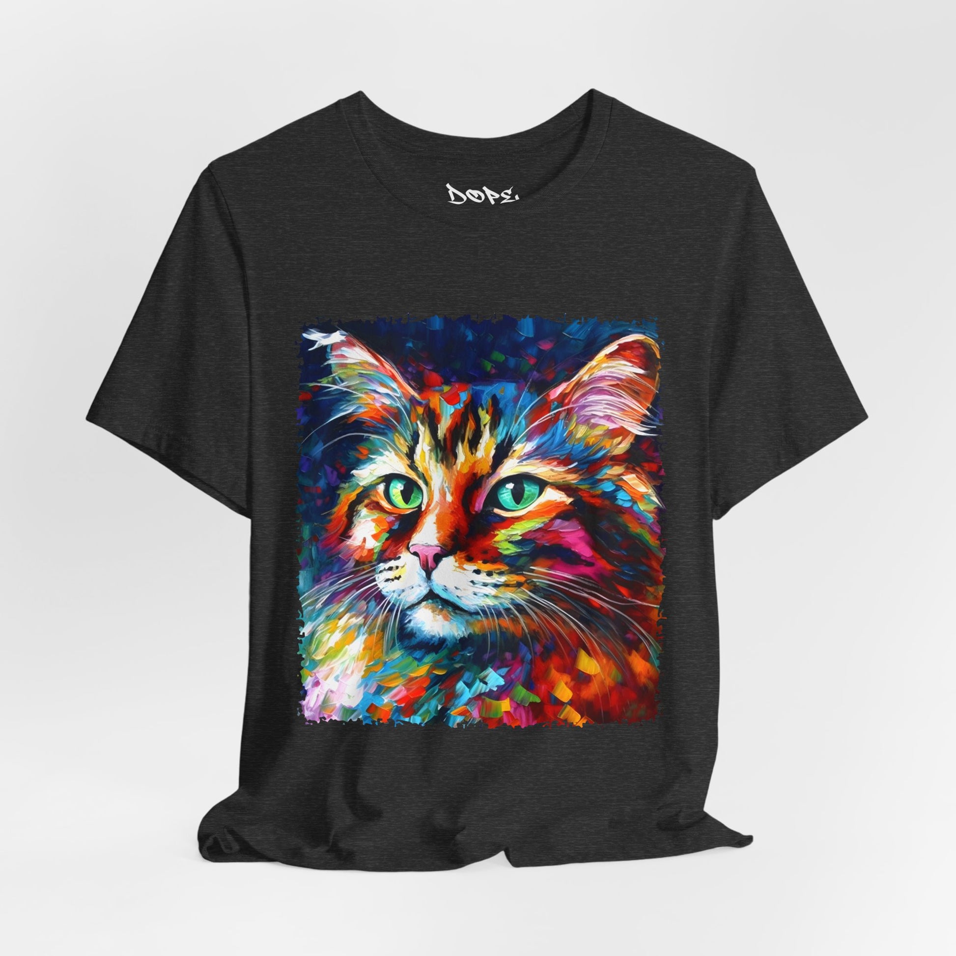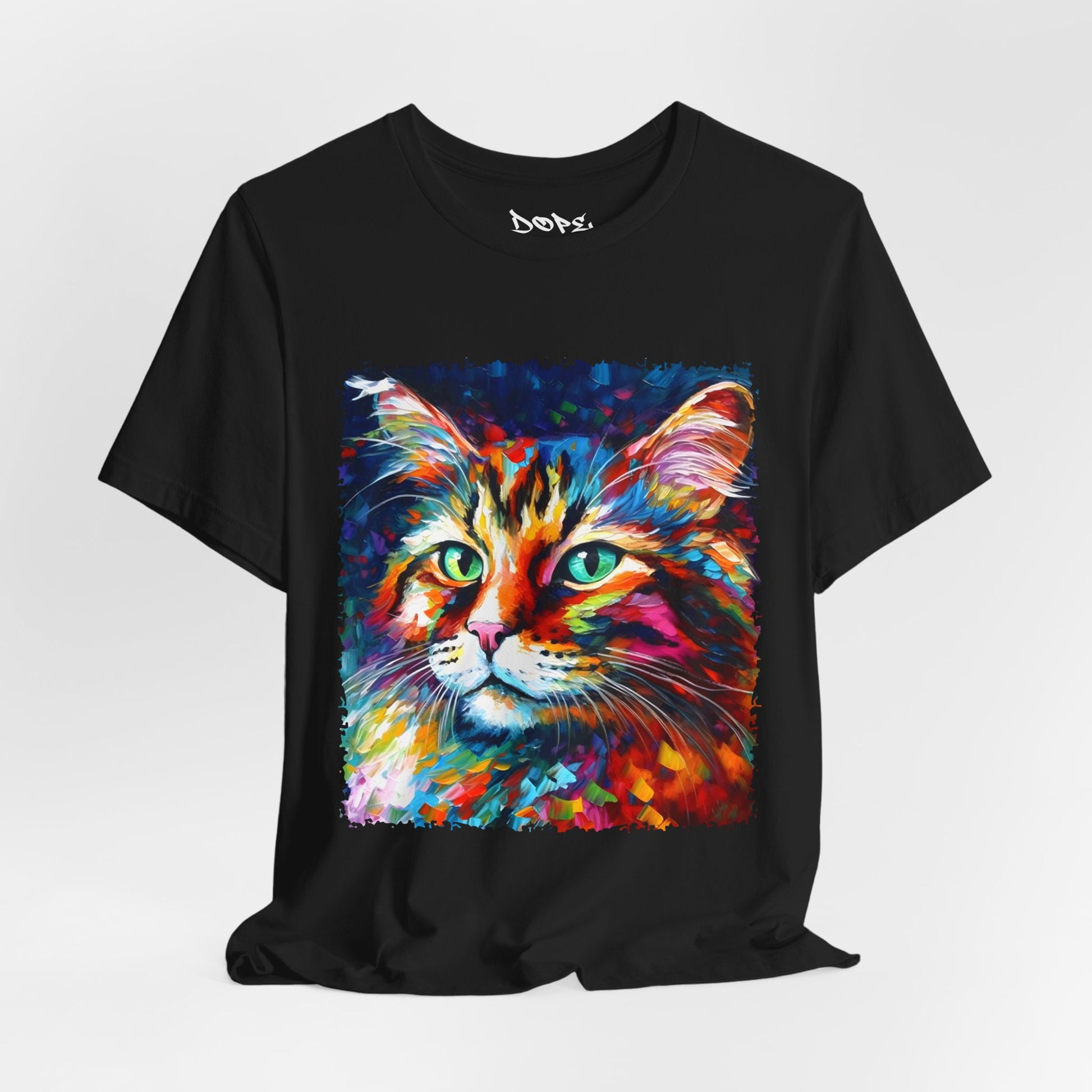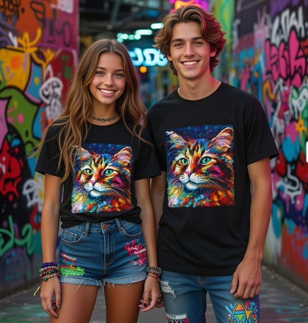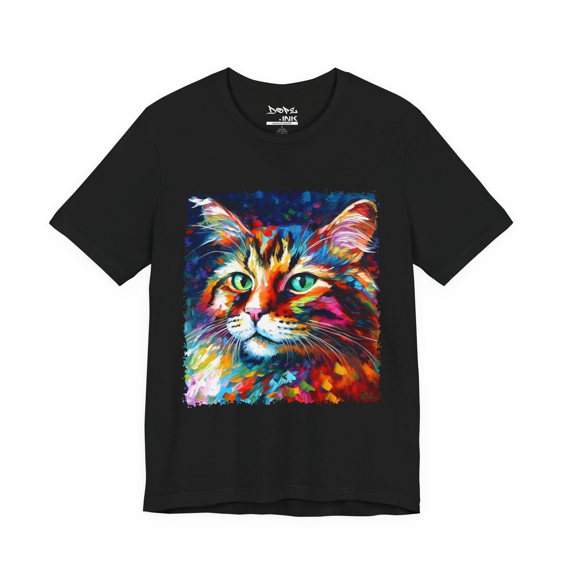 Unleash your inner lion... or lioness... with our "Whiskers" streetwear from Dope.Ink! This black unisex jersey short-sleeve t-shirt features a stunning, colorful portrait of a majestic cat with piercing green eyes, rendered in bold, abstract brushstrokes of rainbow hues—blues, pinks, oranges, and purples exploding like a living masterpiece. Perfect for cat lovers, art enthusiasts, or anyone adding a pop of wild, creative energy to their streetwear rotation, whether you're lounging at home, hitting the cafe, or turning heads on the town.
