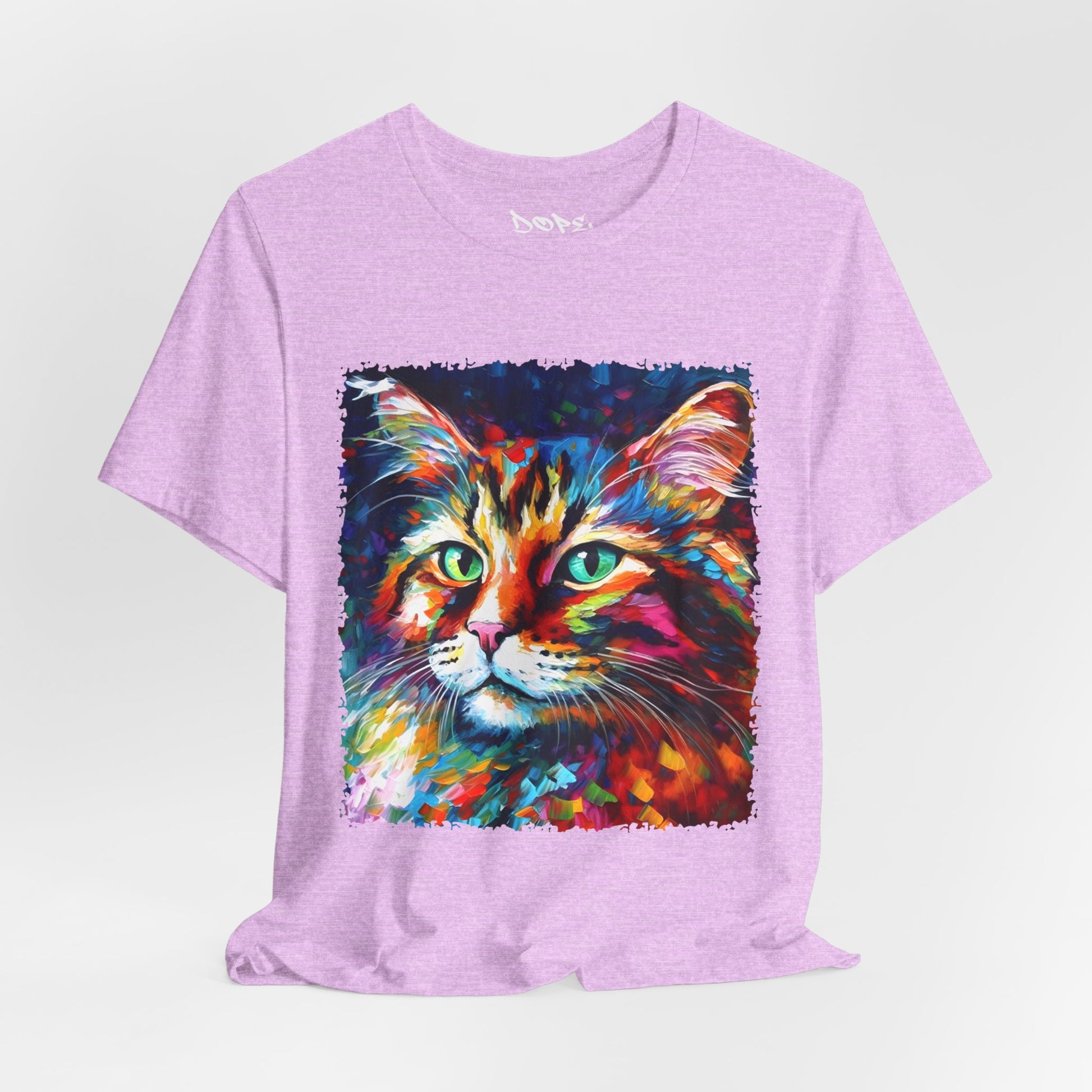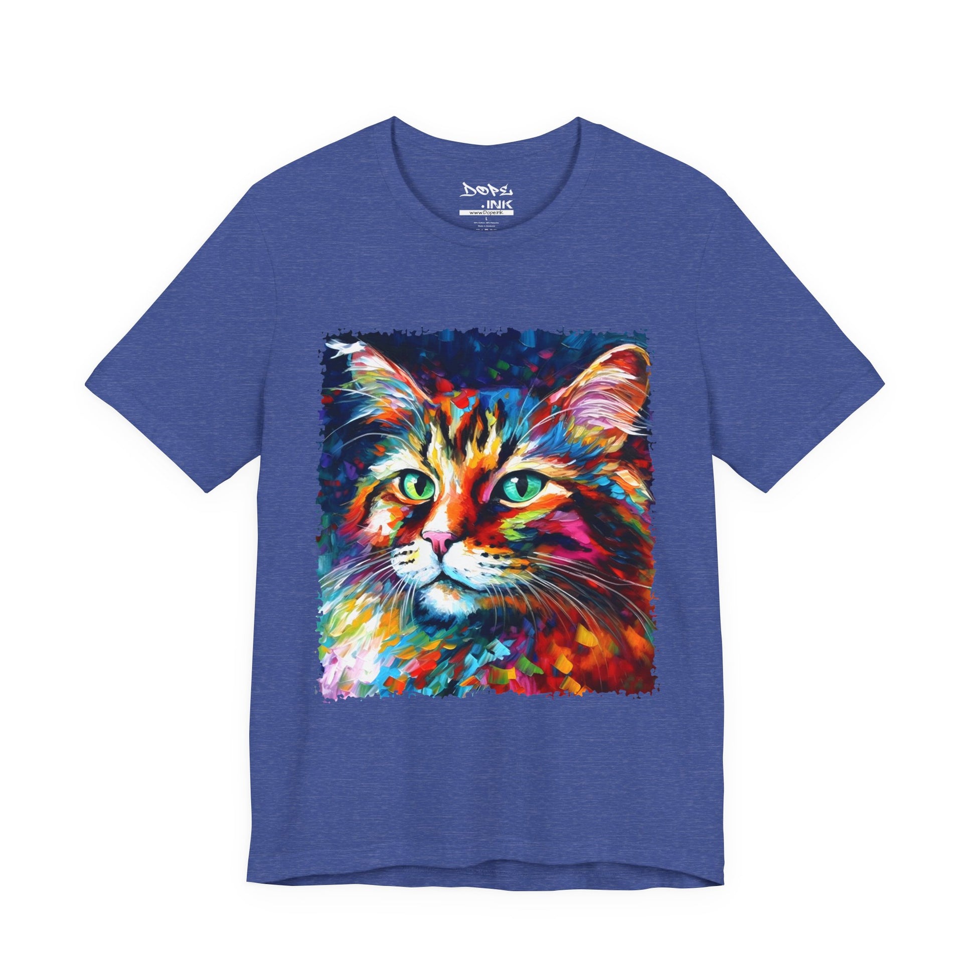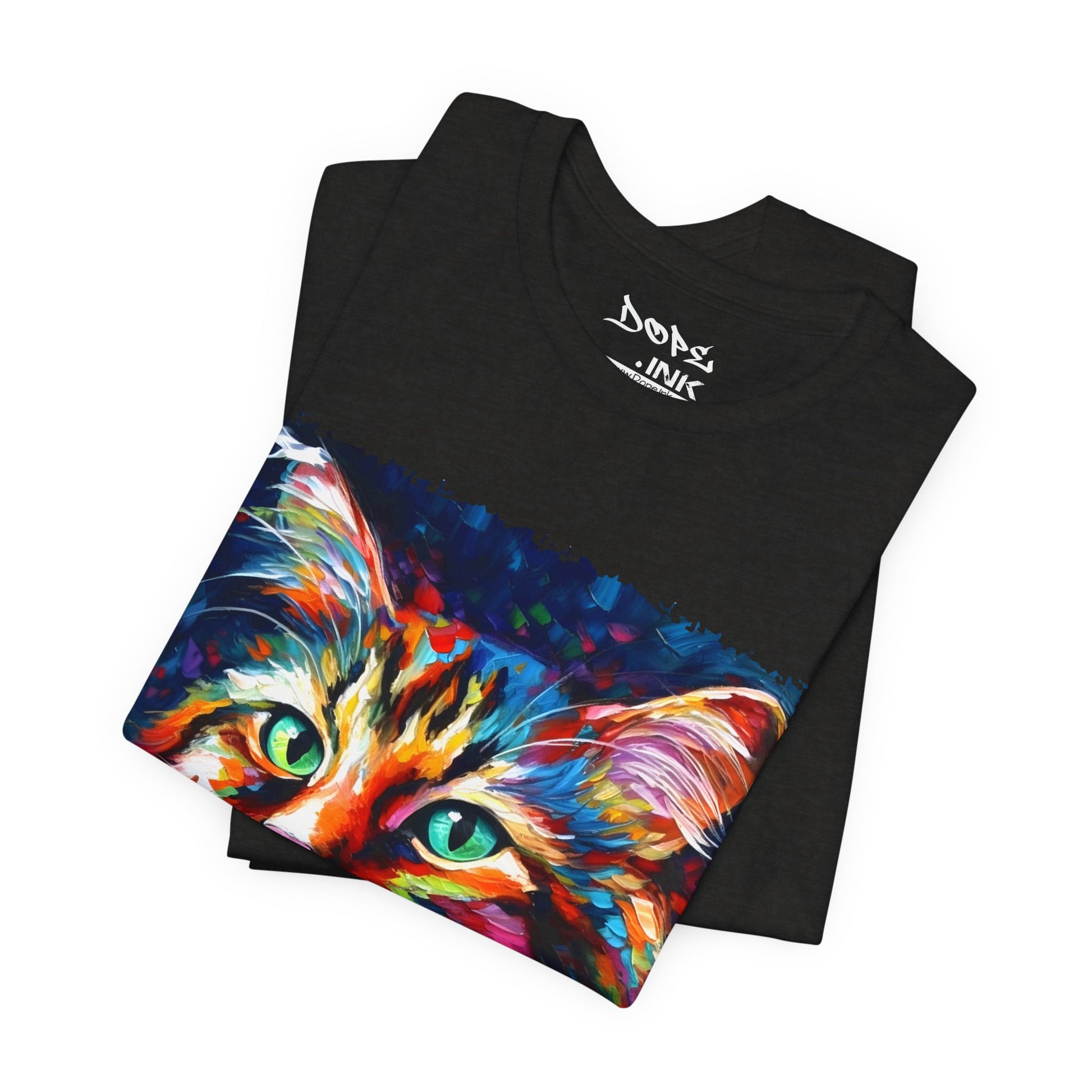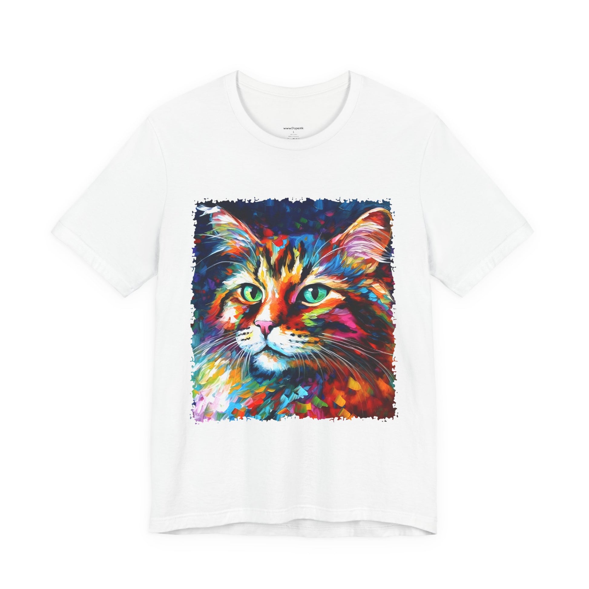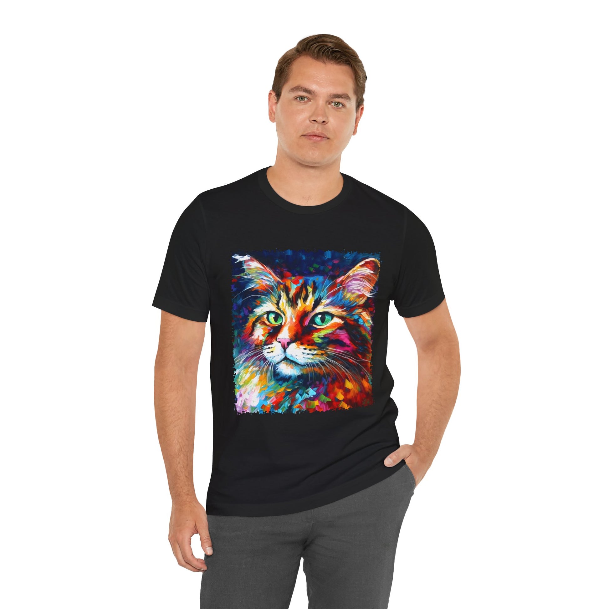 Unleash your inner lion... or lioness... with our "Whiskers" streetwear from Dope.Ink! This black unisex jersey short-sleeve t-shirt features a stunning, colorful portrait of a majestic cat with piercing green eyes, rendered in bold, abstract brushstrokes of rainbow hues—blues, pinks, oranges, and purples exploding like a living masterpiece. Perfect for cat lovers, art enthusiasts, or anyone adding a pop of wild, creative energy to their streetwear rotation, whether you're lounging at home, hitting the cafe, or turning heads on the town.