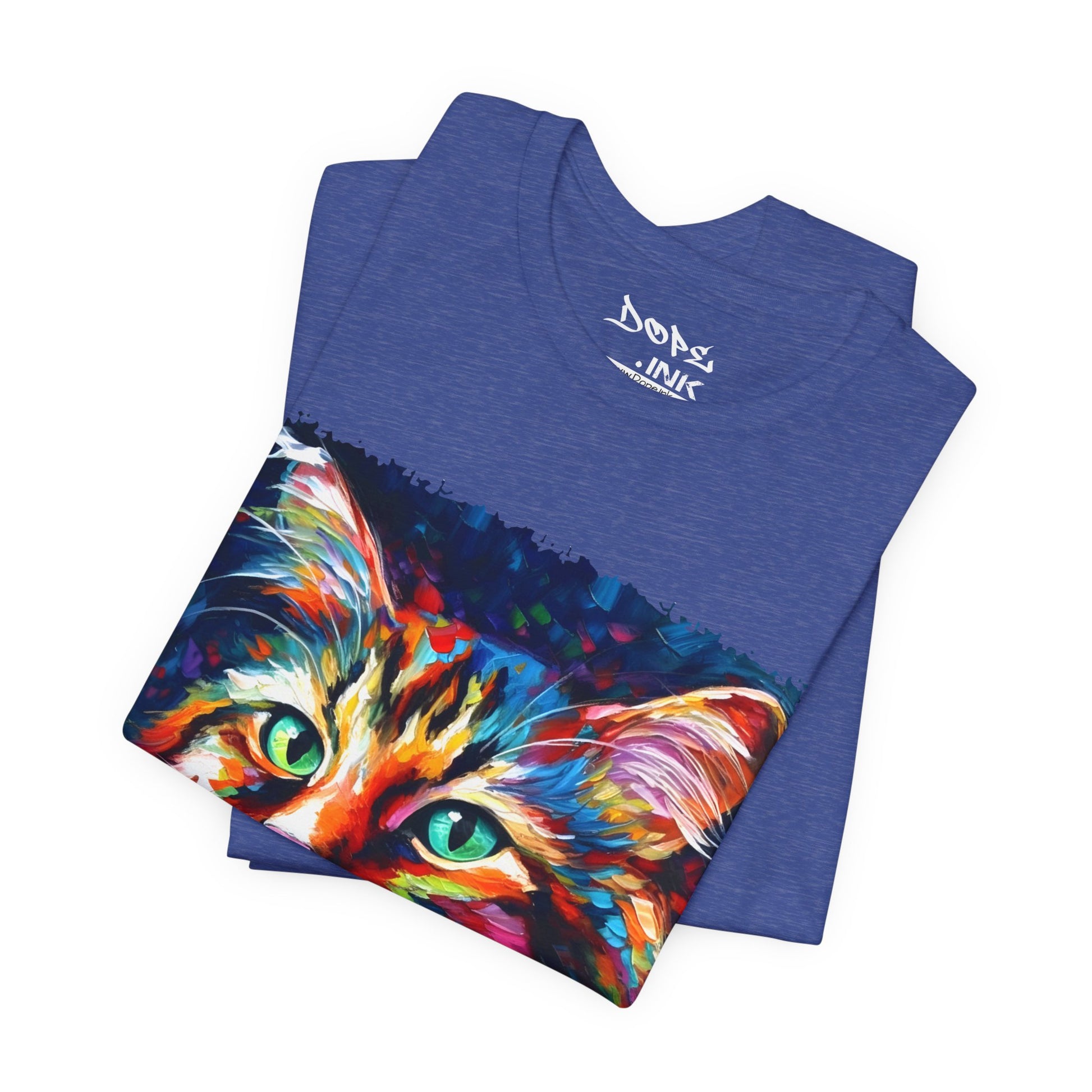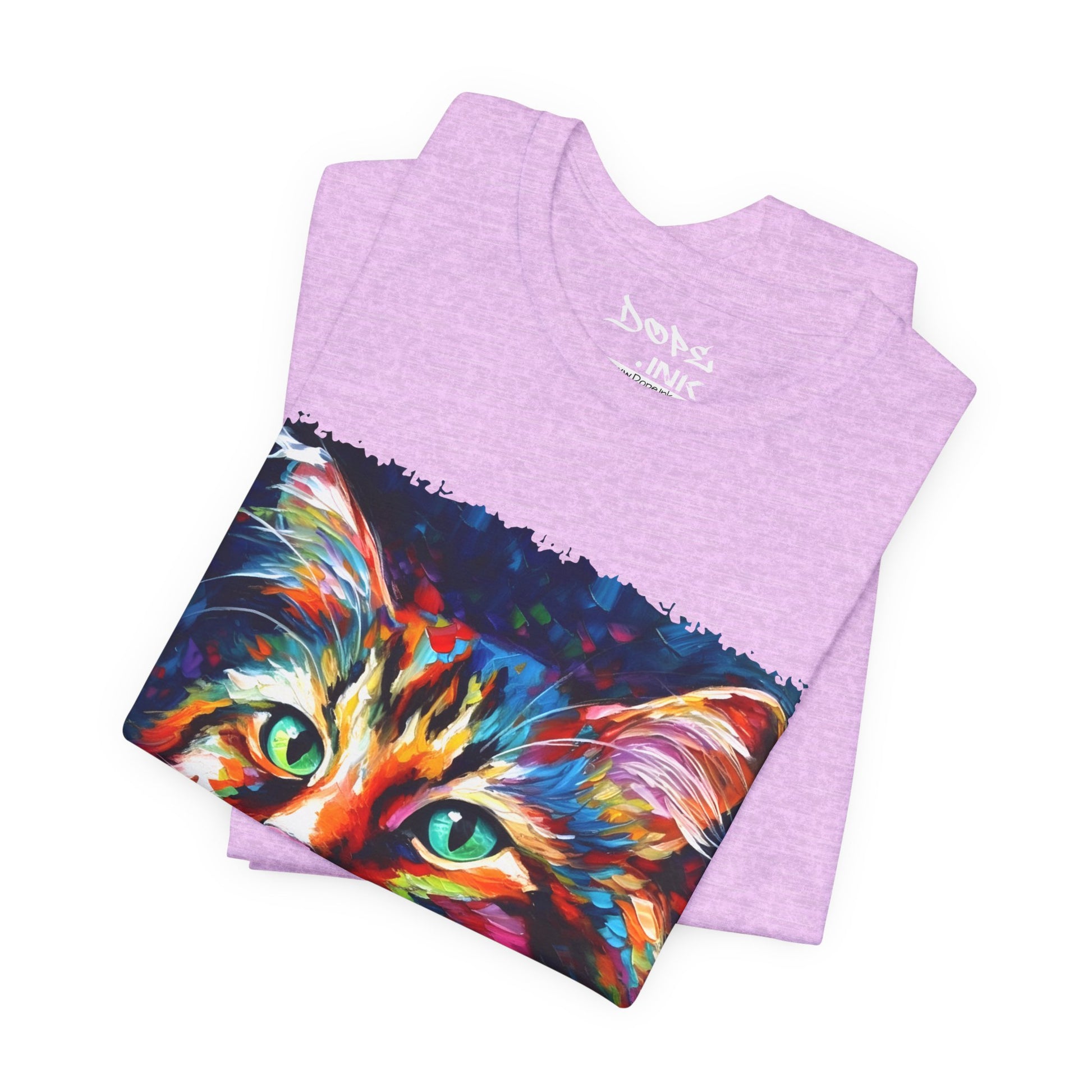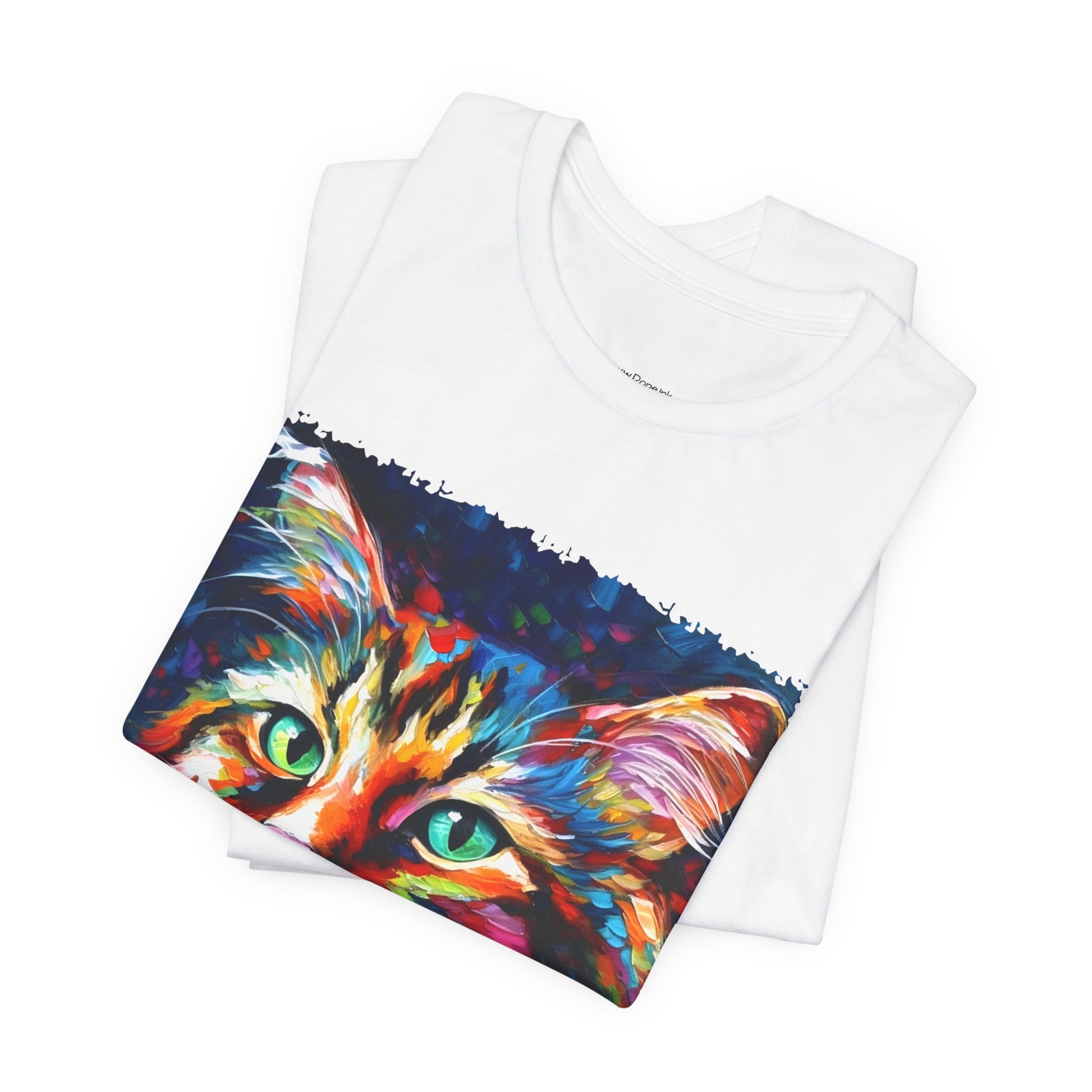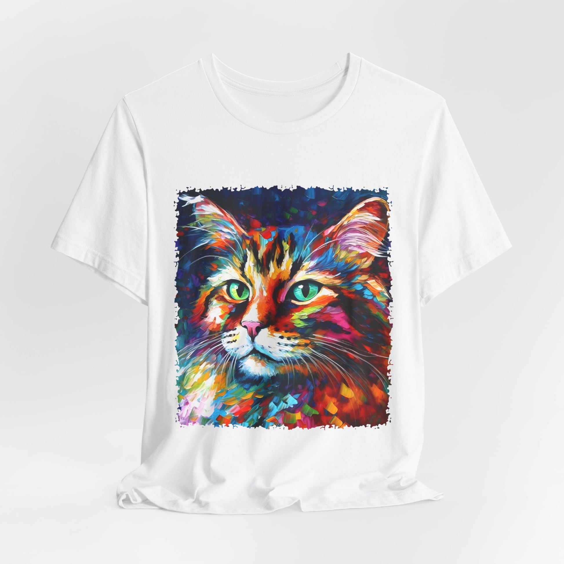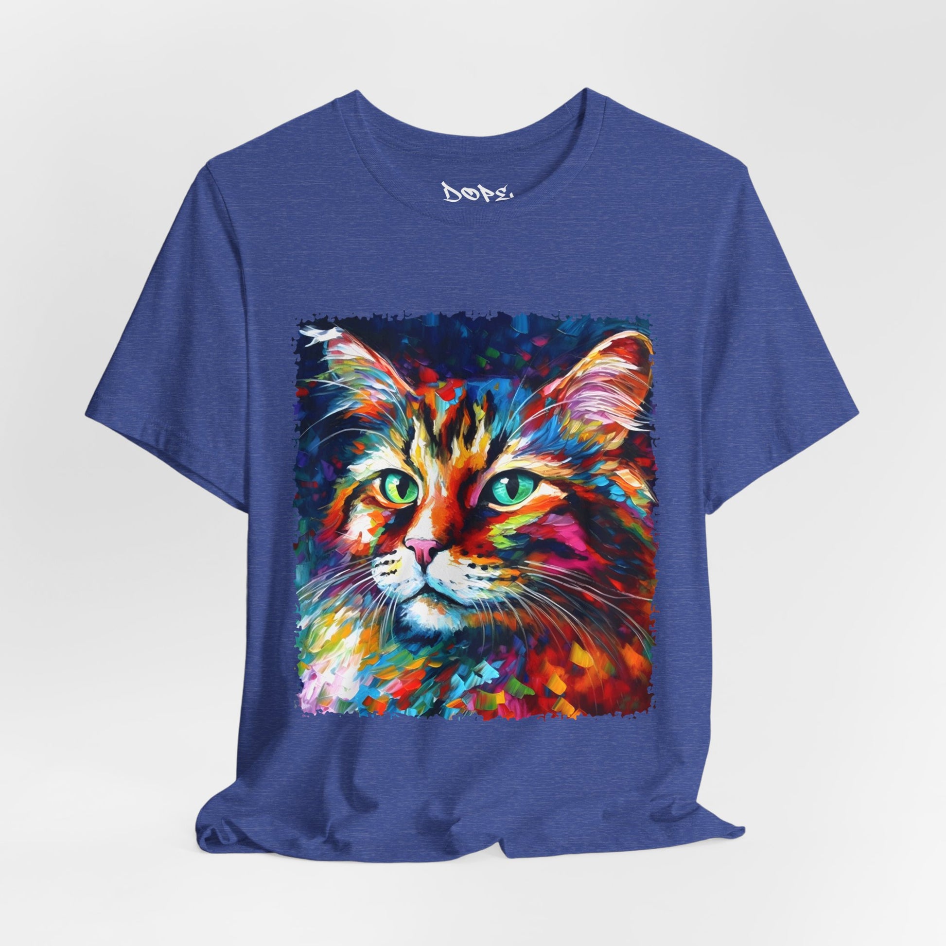 Unleash your inner lion... or lioness... with our "Whiskers" streetwear from Dope.Ink! This black unisex jersey short-sleeve t-shirt features a stunning, colorful portrait of a majestic cat with piercing green eyes, rendered in bold, abstract brushstrokes of rainbow hues—blues, pinks, oranges, and purples exploding like a living masterpiece. Perfect for cat lovers, art enthusiasts, or anyone adding a pop of wild, creative energy to their streetwear rotation, whether you're lounging at home, hitting the cafe, or turning heads on the town.